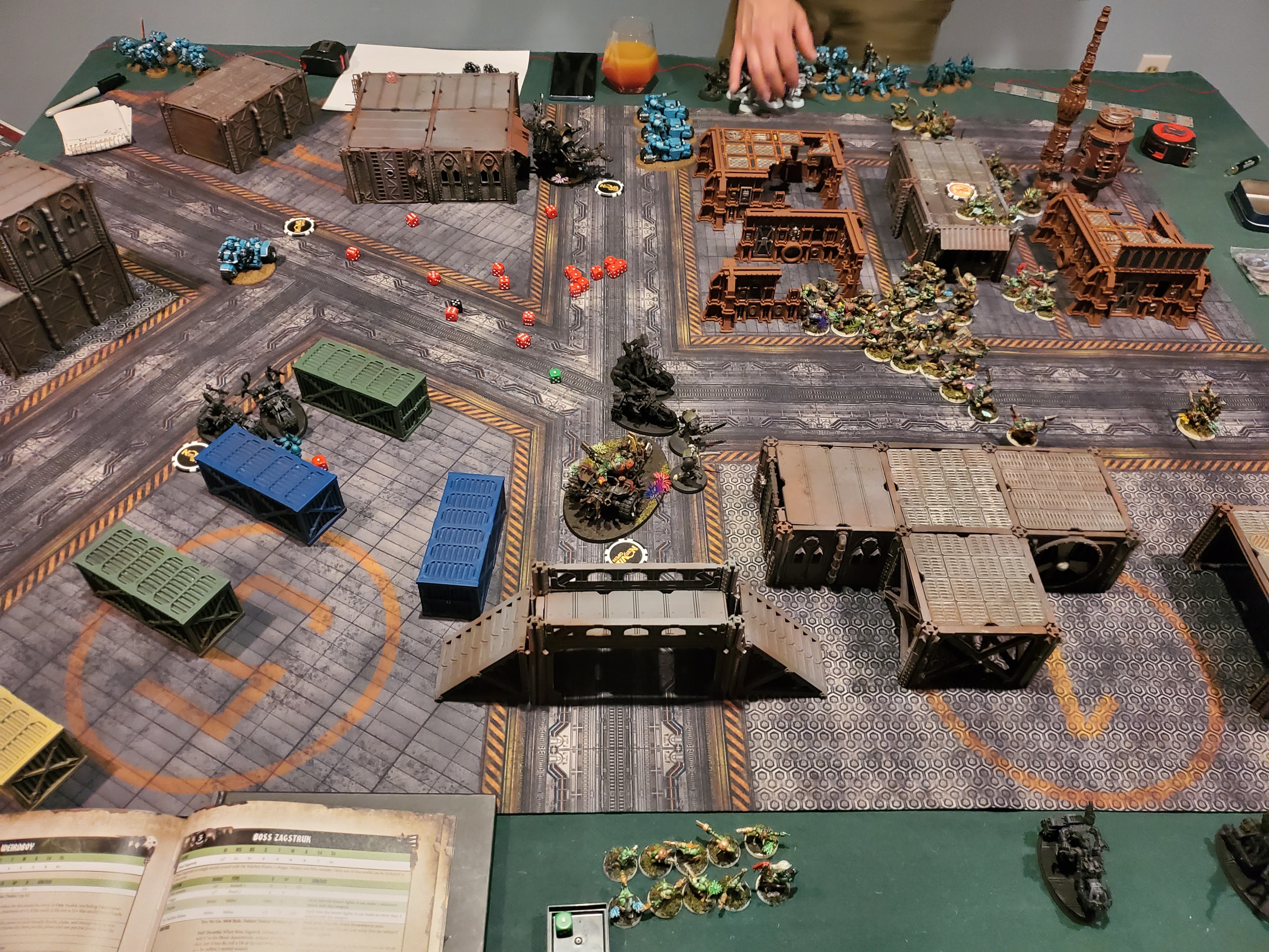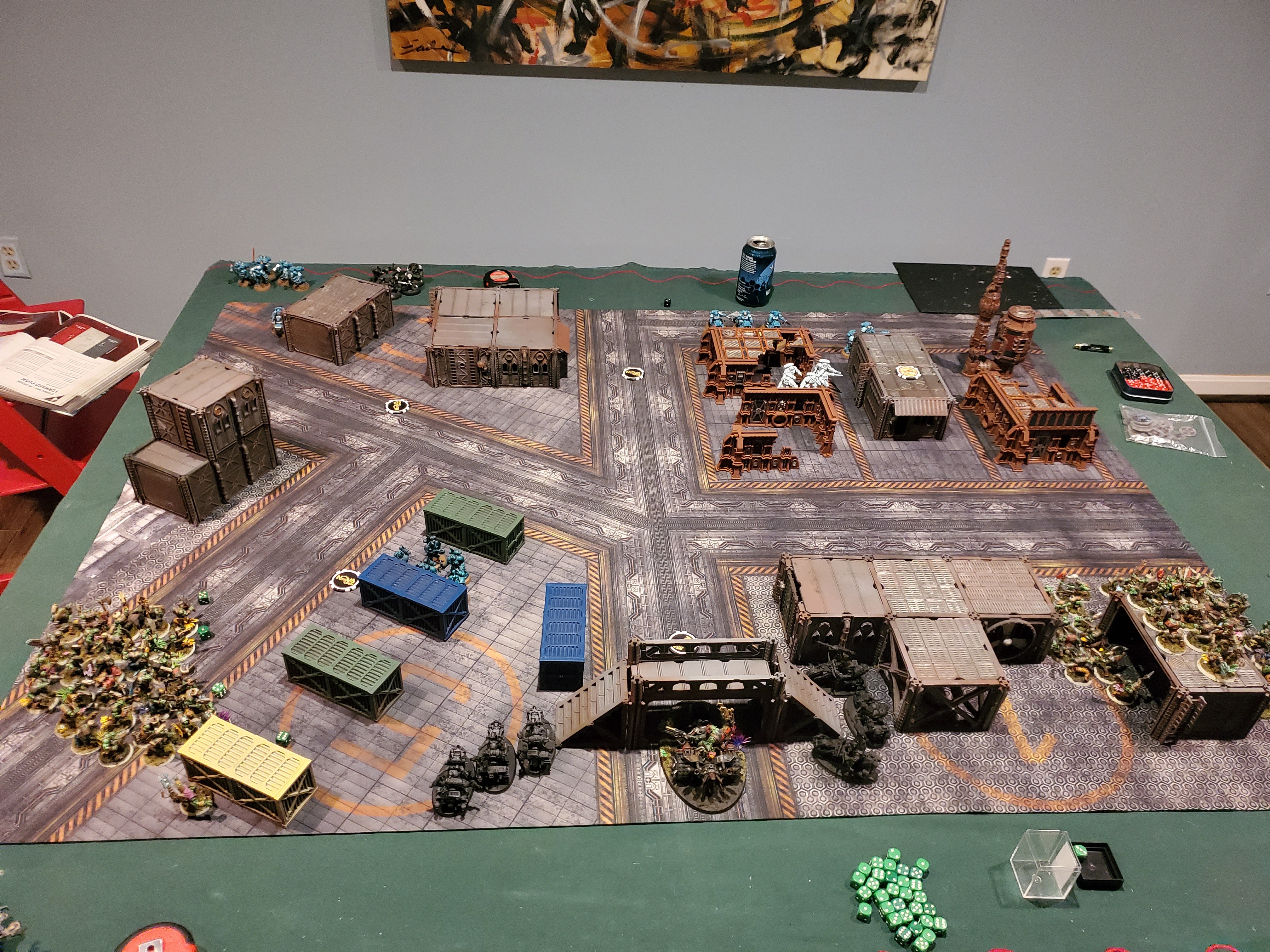 But man, the armies look beautiful when fully painted. Even my army isn’t fully painted here, but I still think it looked great. The board is my quick 3D printed industrial set. The mat is from FLG, and I rather like it. It was easy to use the marked off zones as area terrain.