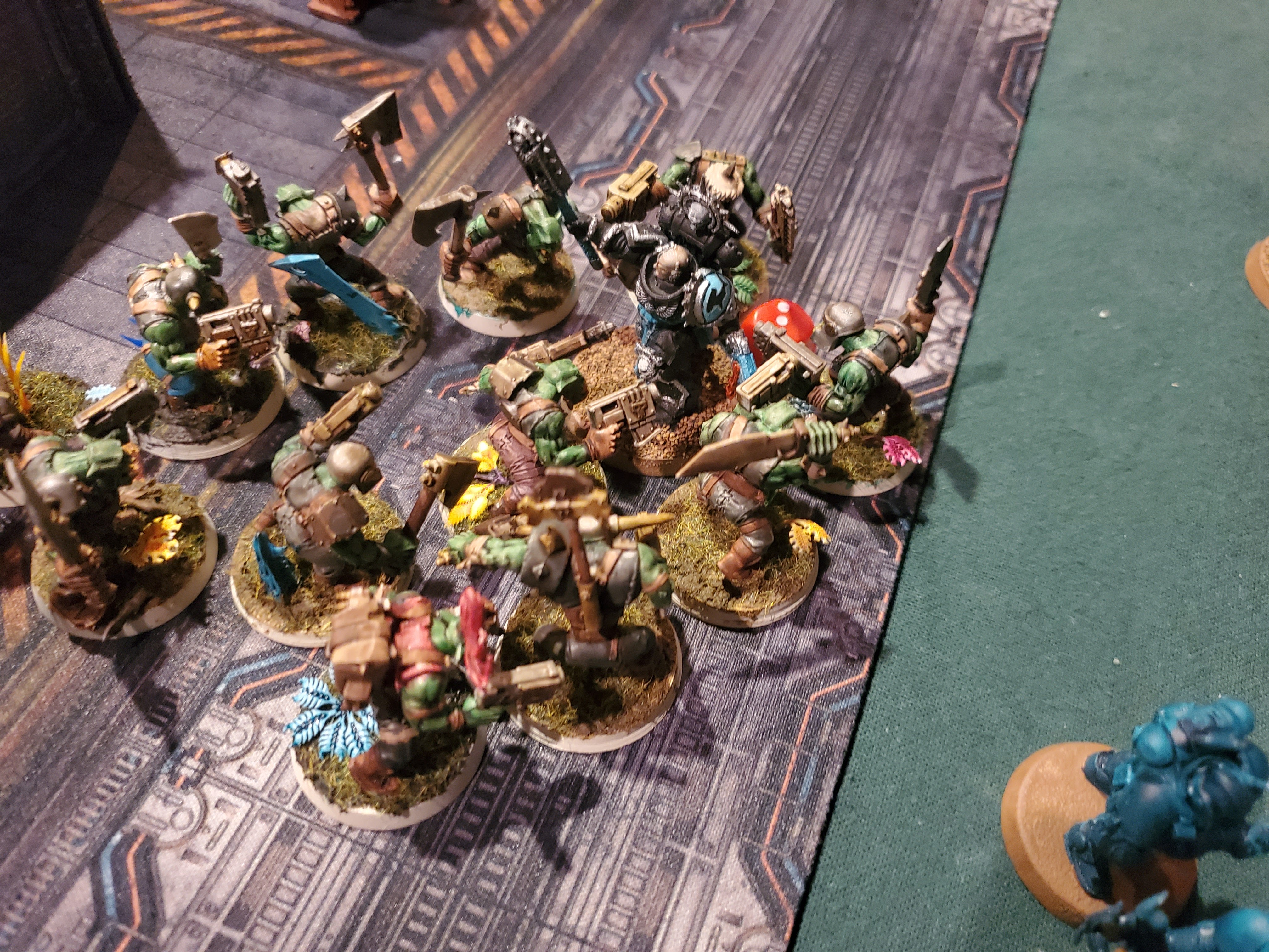At game start I pulled a feint, which is the giant blob of orks on the left flank here. I used my psyker to jump them to the top right corner of the mat. This allowed me to concentrate forces on the right flank while my opponent was spread out.