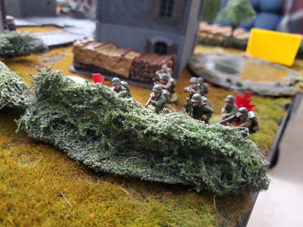 I don’t have a play by play of this match, but the core flow is easy enough: Germans struck hard and fast, reinforced with a long lasting barrage from HQ. Unfortunately, the barrage cut short at the exact wrong time, allowing the Americans to strike back hard and repulse the attack. Despite nearly turning things back around, the Germans lost too many casualties and the men broke and ran off into the woods.