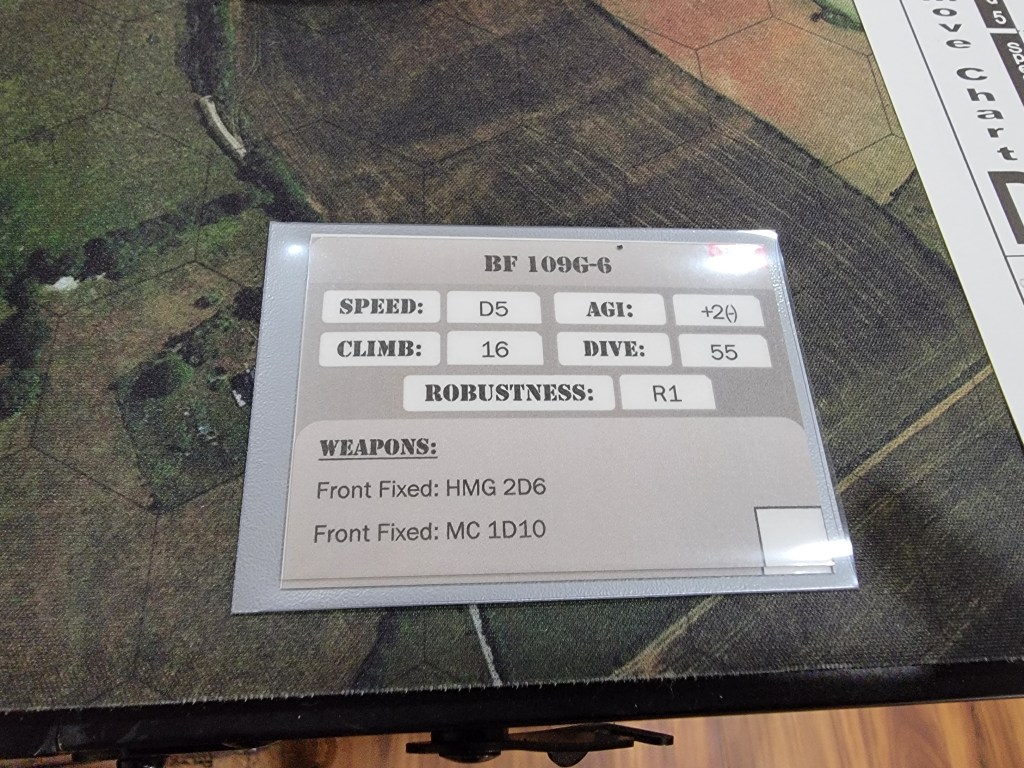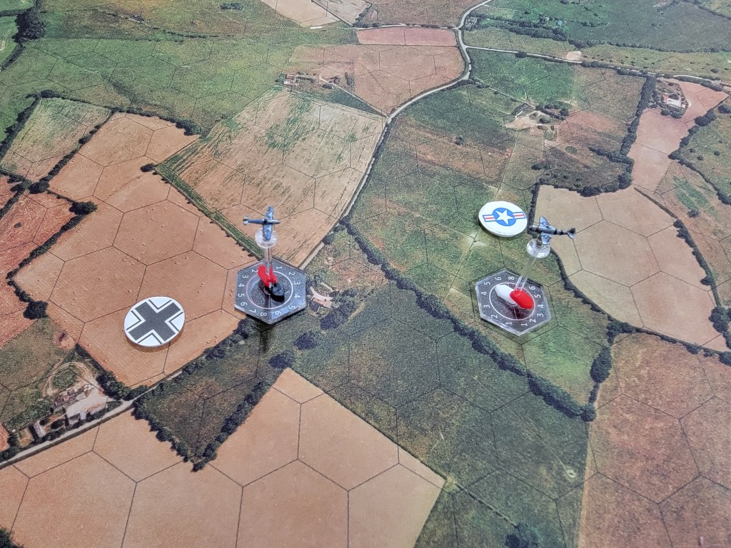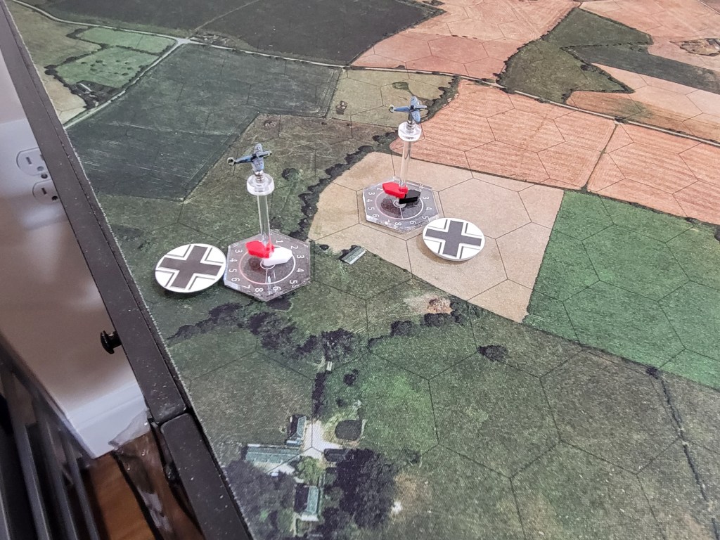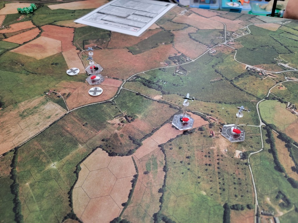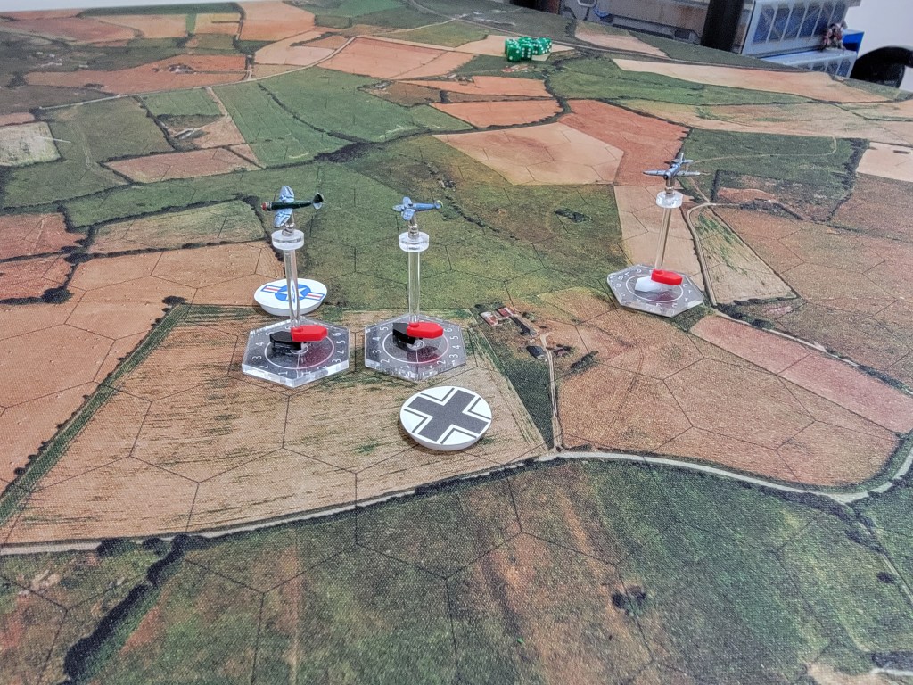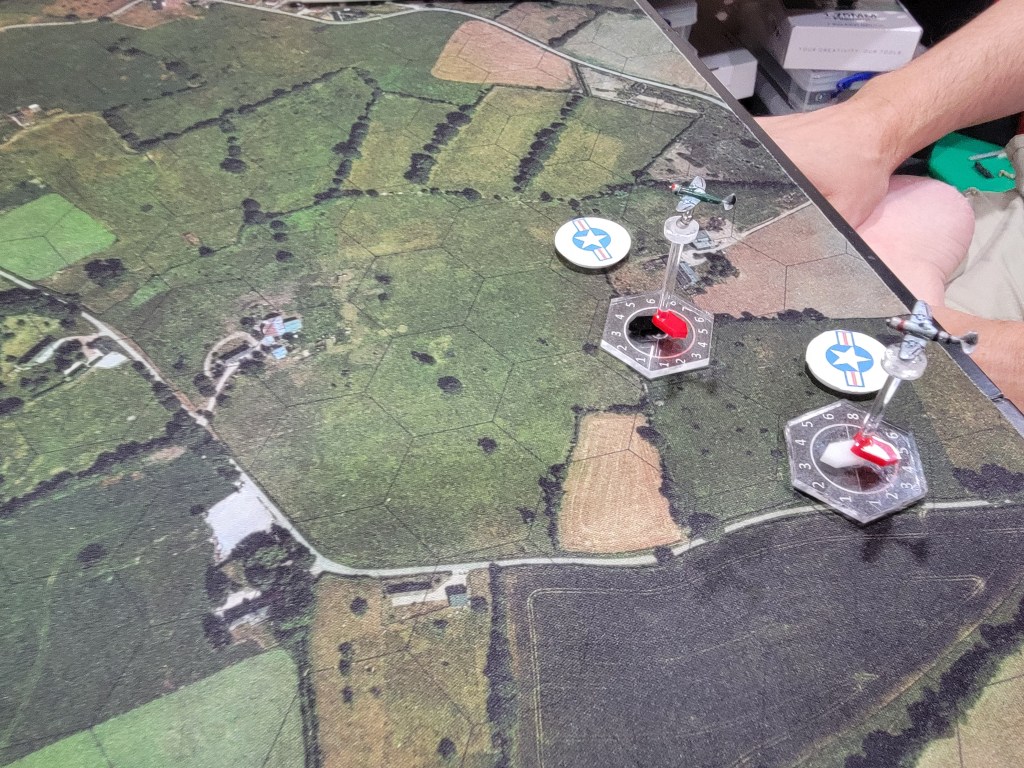 And my thoughts on the game? I really like it! I absolutely look forward to playing with proper flights of 4 and larger planes. Below you’ll find two P-47’s v two Bf 109’s. We each had one Veteran and one Green pilot.