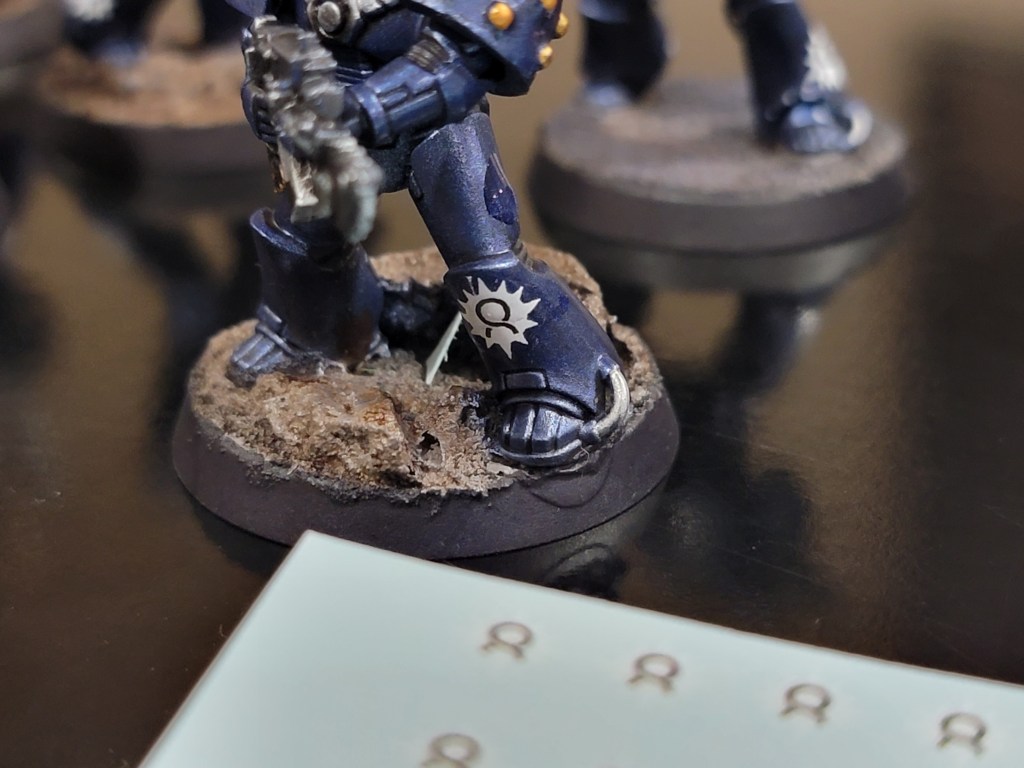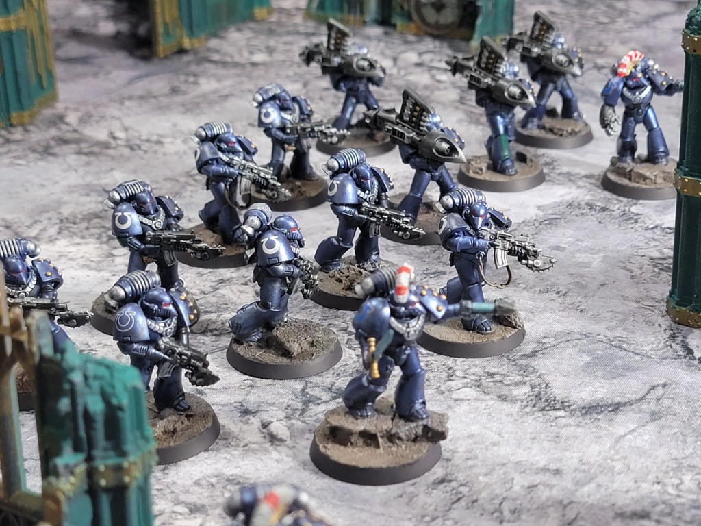 I did finally get my Aurora Chapter markings. Each model generally has a splash of green and the Aurora Chapter marking somewhere in it in a non-dominant position. I figure Ultramarines don’t often change their color scheme during the Heresy and thus wouldn’t go too far with it. They’d emphasize the traditional blue and the Legion markings over their own customizations.
