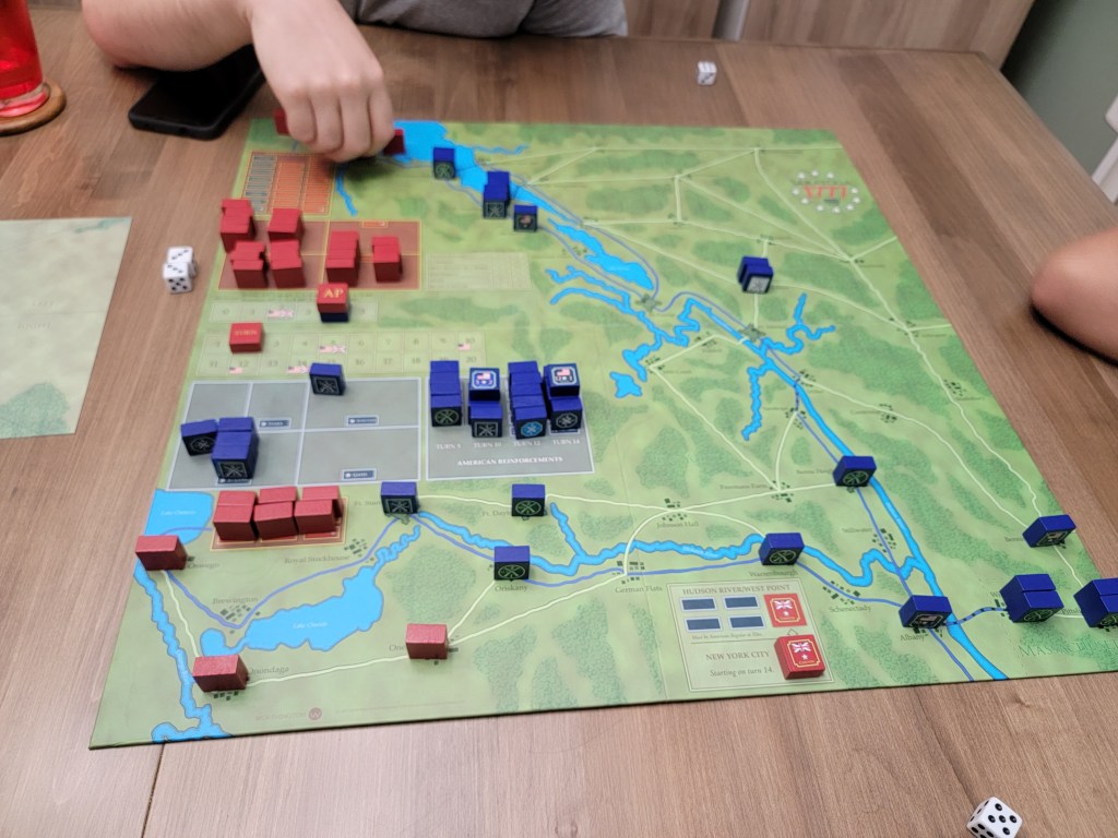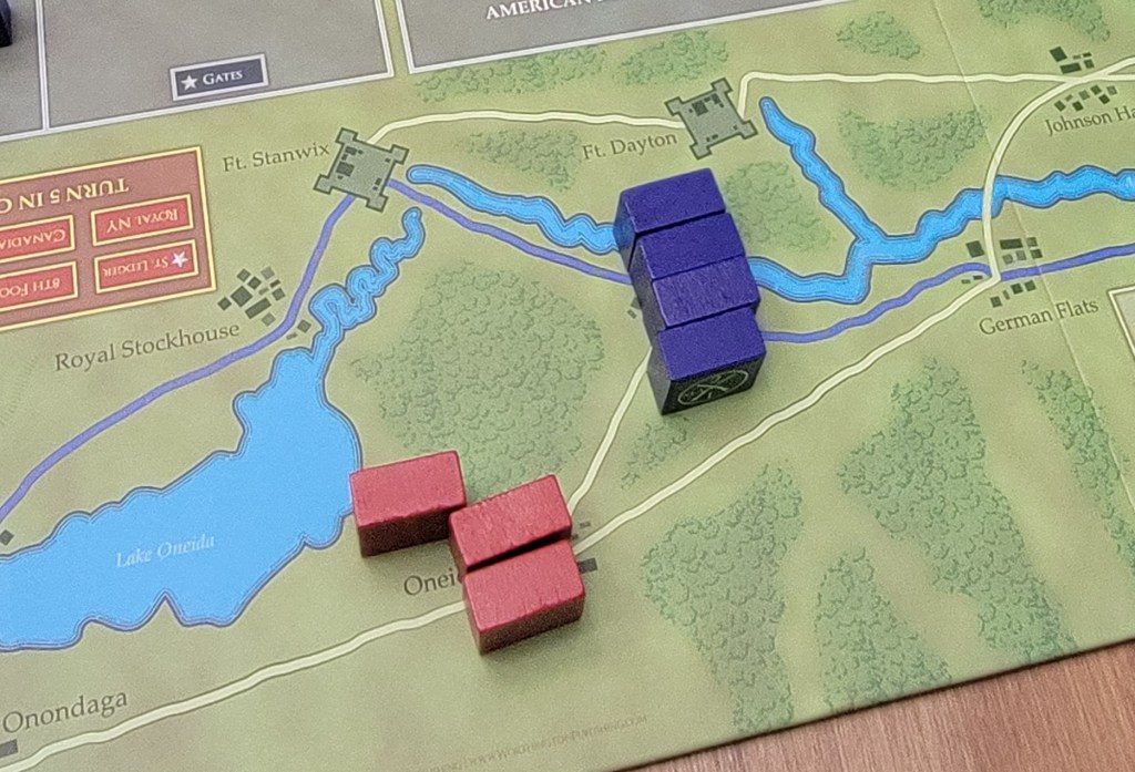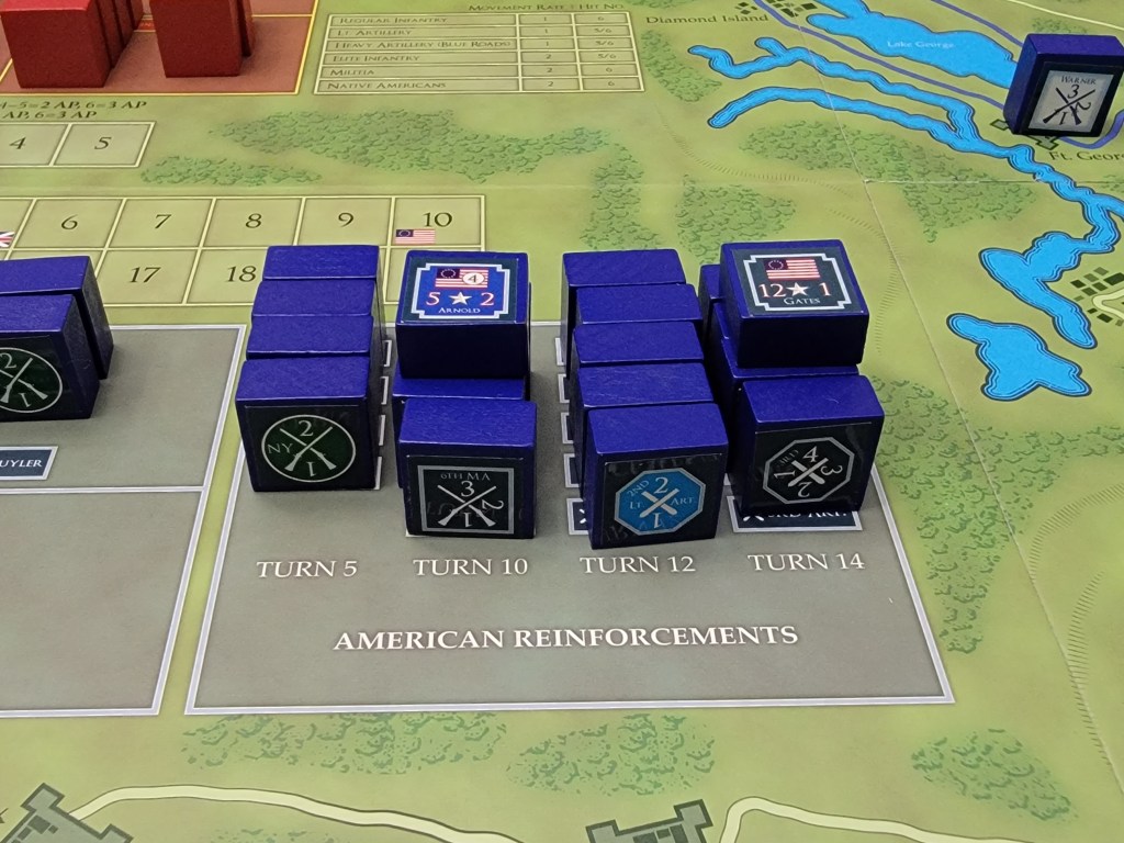 The British seek to win by owning Fort Ticonderoga to the North and Albany to the South. The Americans need to hold off the British for twenty turns. The Americans start weak and gain strength as the game goes, so they’re playing a delaying action trying to buy time and wear down the British until significant reinforcements arrive.