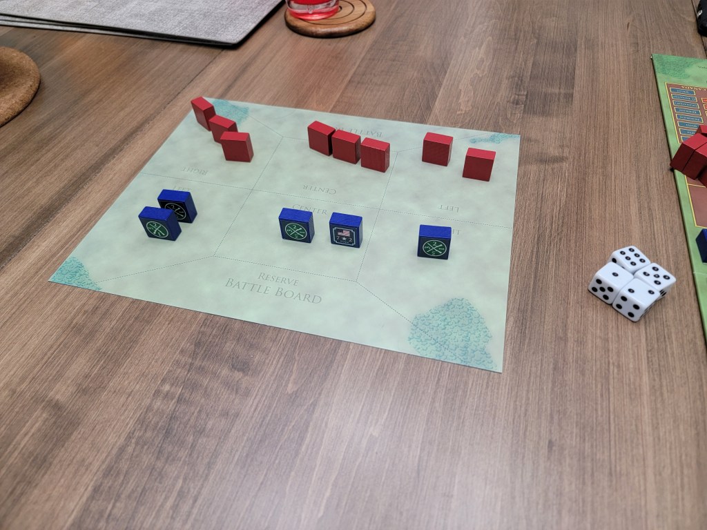 When you overlap an enemy, you battle, which is executed on a seperate tactical map. Battles are simple affairs where you first assign troops to one of three flanks or reserves. Then you reveal them. Each unit rolls dice based on how many Strength Points (health) they have left. First to lose a flank loses the battle and is pushed back on the operational map.