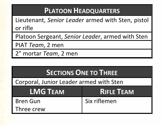 Add that all up and your core platoon consists of 36 models. I recommend basing each individually at 28mm to make them easy to track, though there’s an argument for basing the PIAT and Mortar Teams on one base or even the LMG + one or two additional men on one base. As a rule LMGs always have at least two men associated with them. At 15mm, I would base the weapons teams on one base and base the riflemen on single bases.
