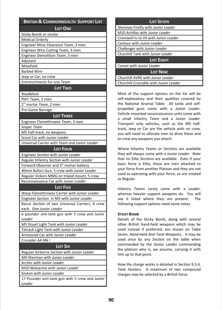 You’ll find each force has a section on support with various numbered lists. Each list is a list of support options that COST that number to bring. So for example: an additional section of infantry costs four points to bring and is on List Four. If we rolled 9 points for the match, I’d maybe bring that section (4 points) and maybe a 6 Pounder Anti-Tank Gun (5 points) for a total of 9 points of support.