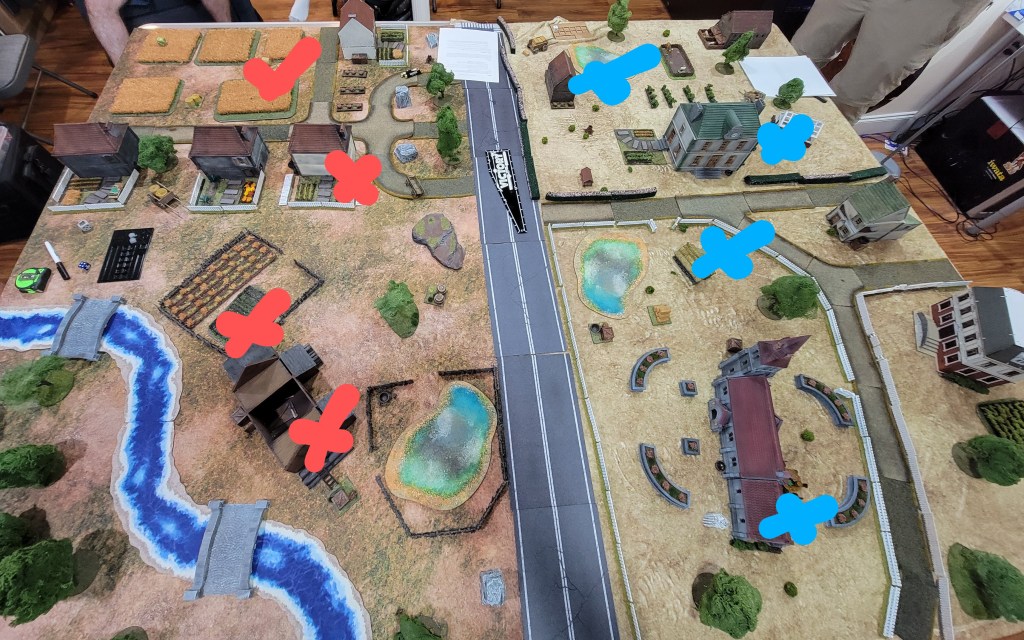 In the event of a force concentration on the South or North flanks, Blue hoped to have enough cross-fire and a well positioned AT gun that would allow them to respond appropriately.