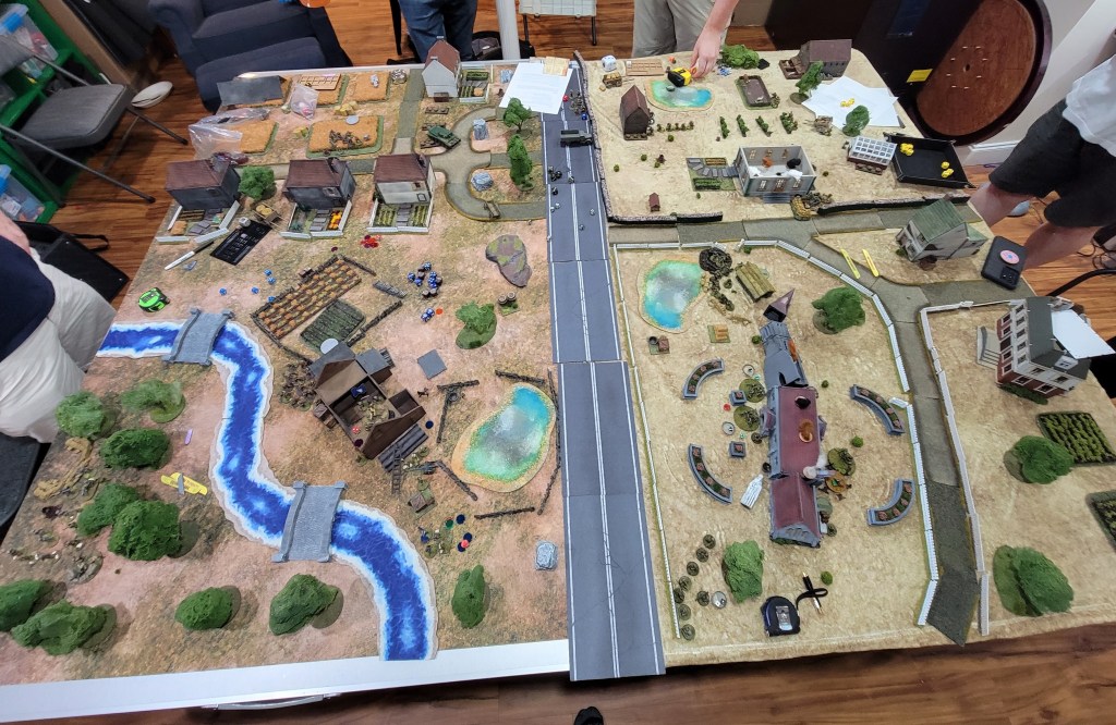 It’s worth noting we were not remotely historical. As the game was learning focused, I let everyone bring whatever they wanted. The result was that we ended up with Americans and British (Defenders, Blue Team) versus Chinese and British (Attackers, Red Team). The Chinese used the German platoon structuring. You will see some German assets on the board belonging to Red Team.