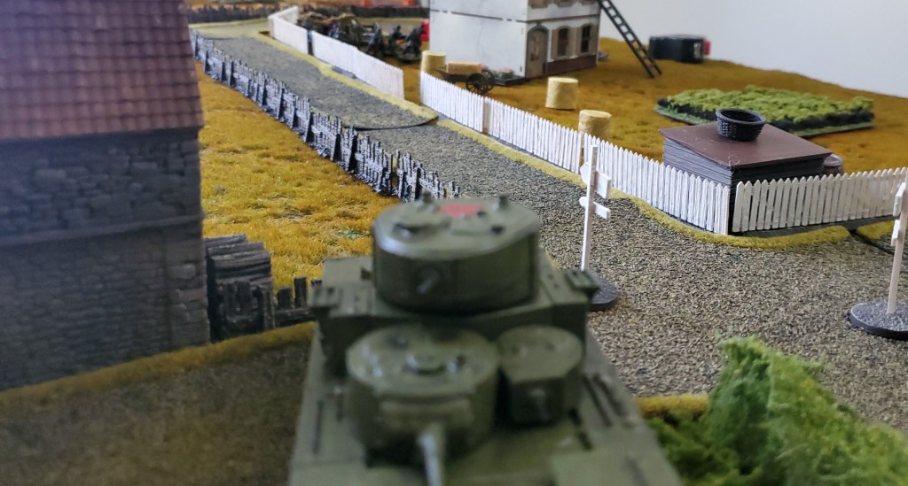 Immediately breaking a rule. This game takes place on two separate tables. One table (Table A) has artillery, lightly defended, being assaulted to shut it down. Until the artillery is stopped, it will continue shelling Table B, placing two areas of smoke on the table to shield an assaulting force attacking a defender. In this manner, both sides are attacking and defending. Victory depends on Victory Points so the actions of either table may very well win the game.