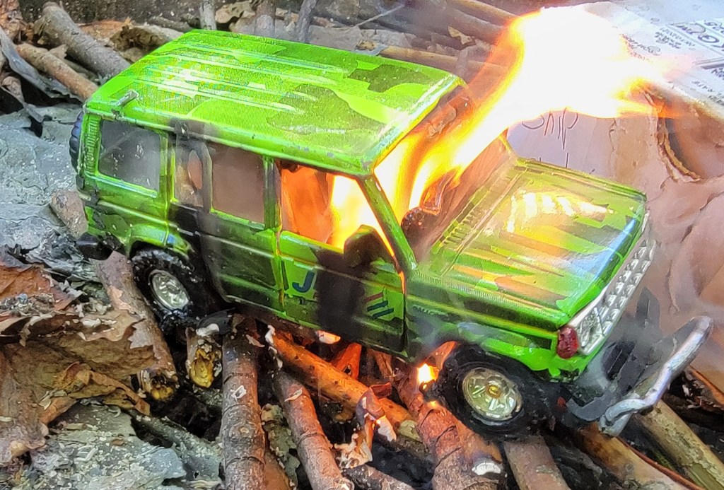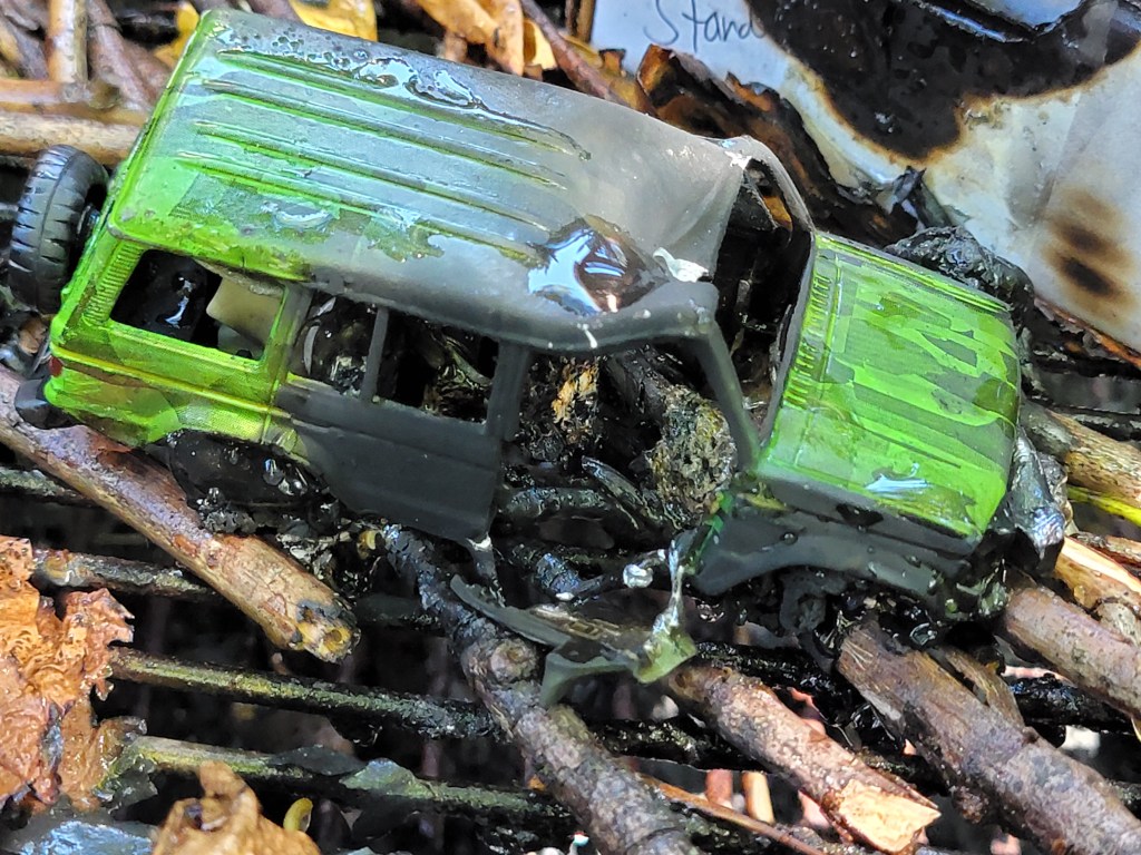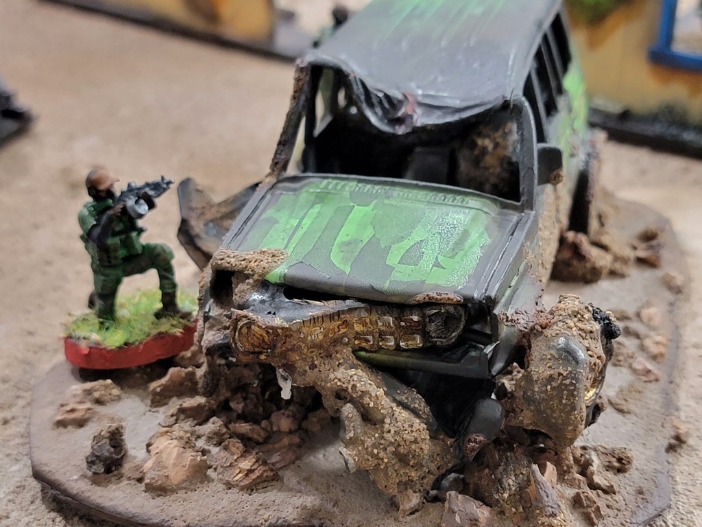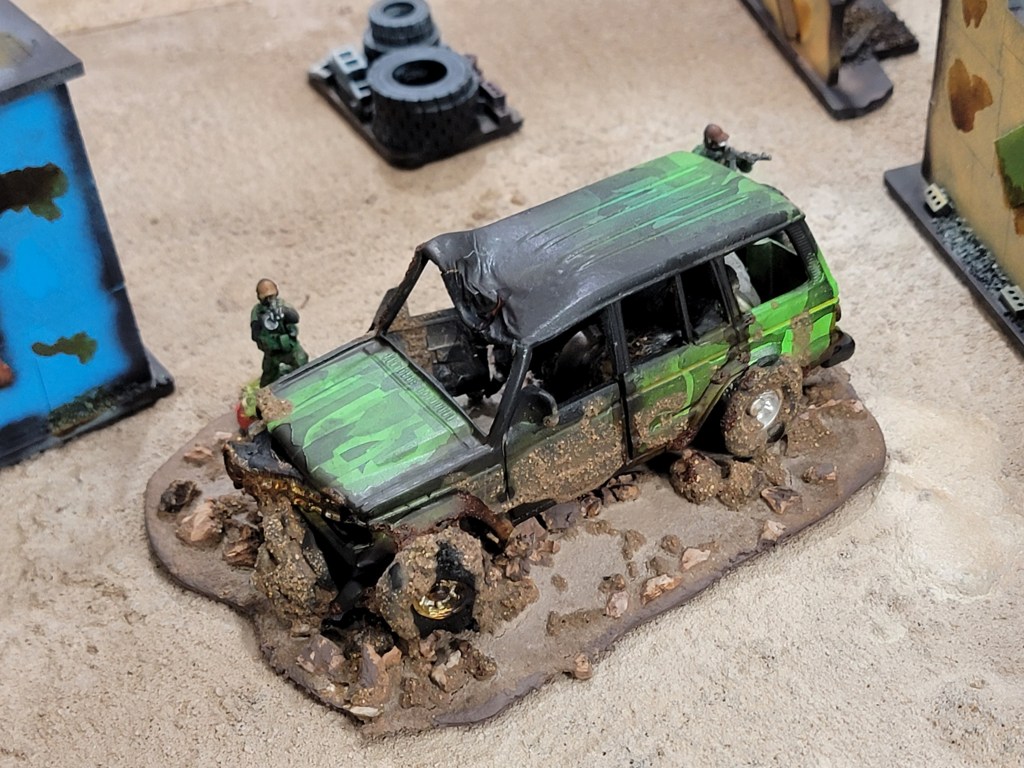 To help punctuate the shanty towns, I produced a wrecked vehicle with a $5 diecast toy. I’m unsure of its scale, but it looks good on tabletop. I find you can play with the scale of vehicles so long as they’re consistent with each other. To produce it, I lit the truck on fire to produce a believable burn effect. Then I varnished it and used Dirty Down Rust to weather. The basing I did the same way I did the desert boards the terrain is sitting on (more on that below).