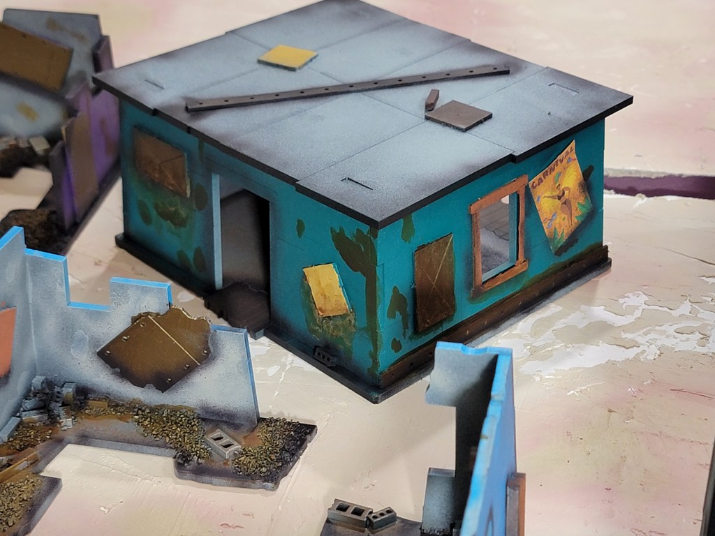 My inspiration was Brazilian favelas—I liked the idea of a very colorful, beat-up area. It made for a fun, relatively small project. I added some sand and bits of broken MDF, as well as bricks from the kit to the edges of buildings and insides of the ruins to augment them. I find that with MDF you always need to put more detail on to make the kits worthwhile, so I did appreciate that this kit came with scatter, bricks, cinder blocks, and other small details like the panels you can glue onto the outside of the buildings.