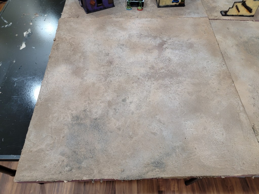 The other thing on display here is a few 2×2 desert boards I built. I took the time to build some reasonable looking, flat desert boards. The idea is they can combine into a 4×4 for games like, say, Infinity, or they can be used as four separate boards for InCountry. The process here was nothing revolutionary: I layered spackle, followed by grout compound, followed by a PVA/Water/Sand mix onto 2×2 insulation foam tiles. It produces strong boards that don’t chip easily but may warp mildly. Plenty good for my purposes.