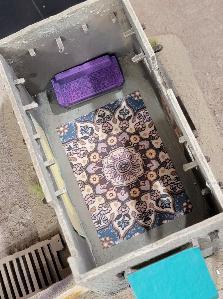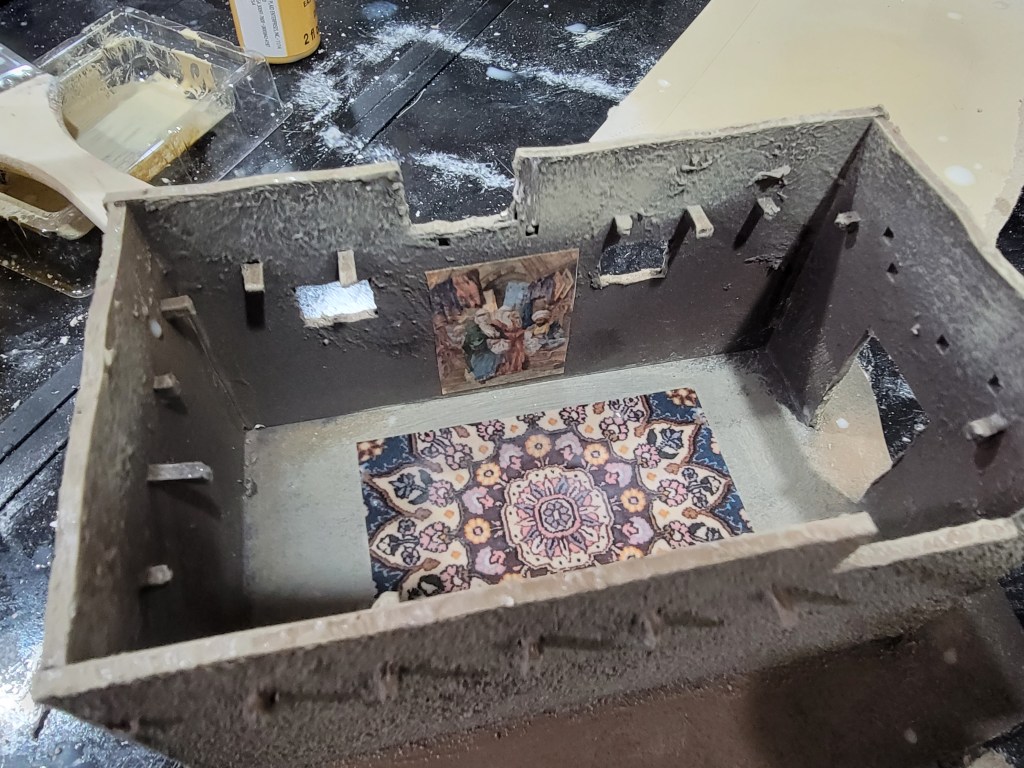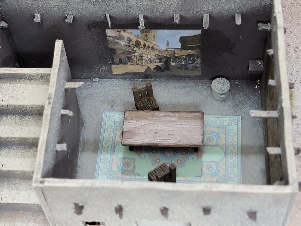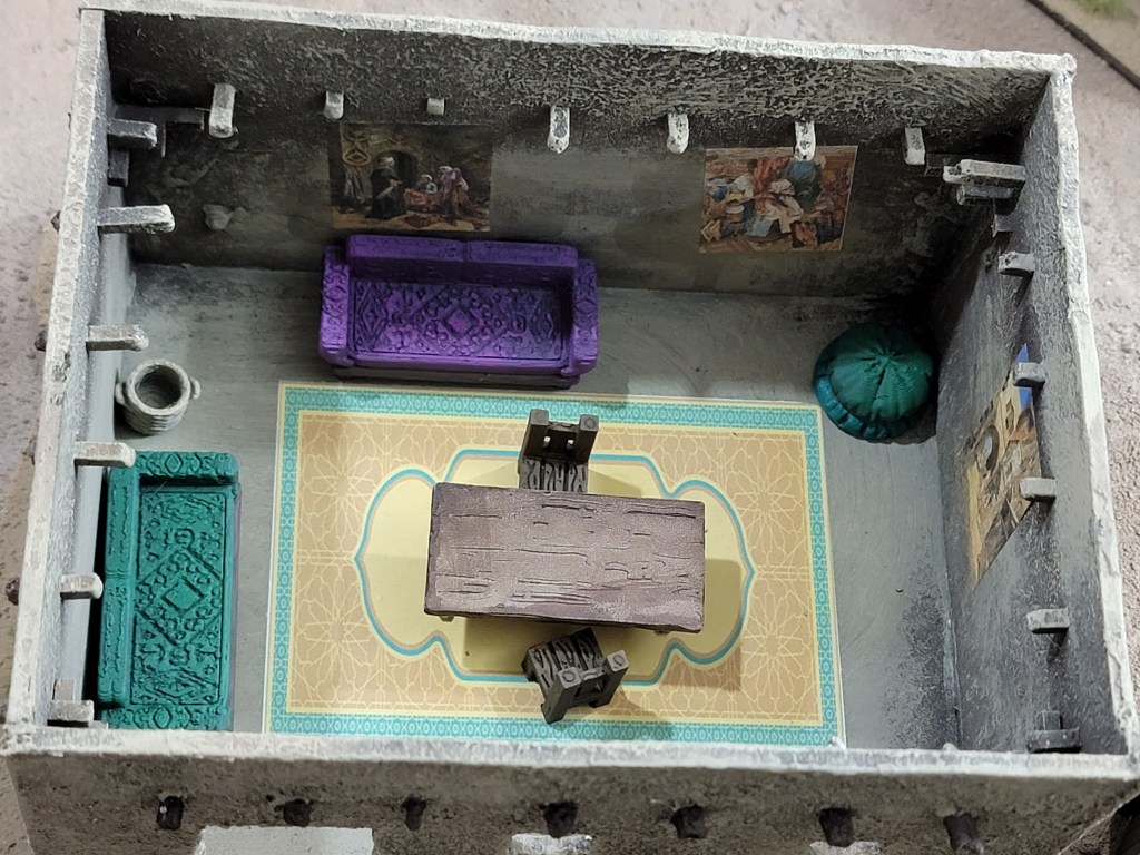 Okay, a bit more, but not too bad. But as I did this I figured I’d have models inside the buildings a lot… so I should really put some paintings and rugs inside to improve the set. This necessitated basing the buildings as they had no floors.