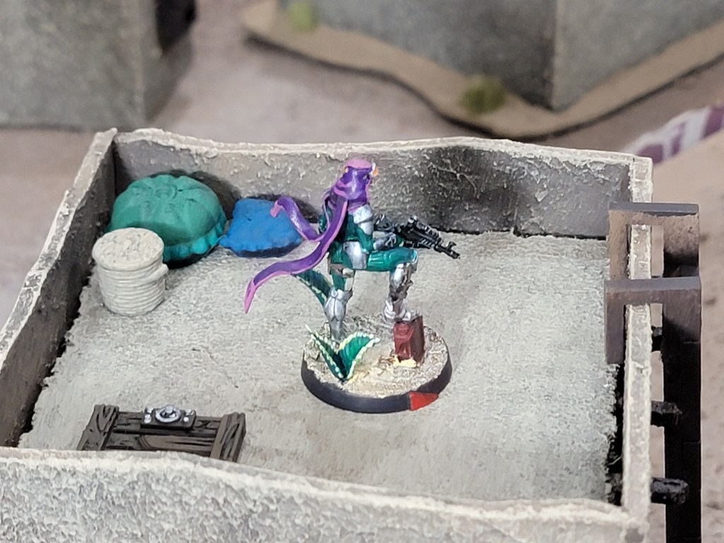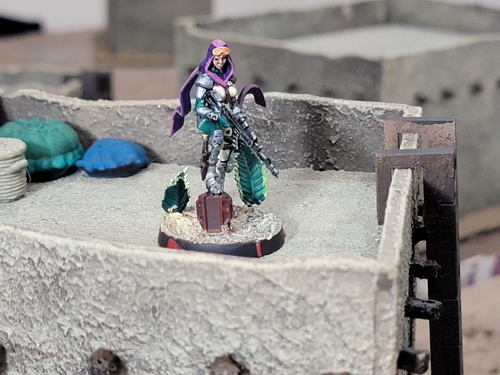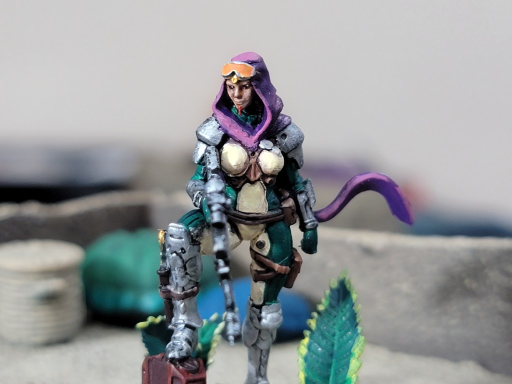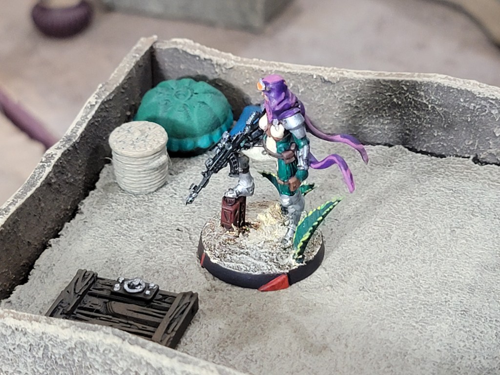 As a test case for getting into Infinity, I bought and painted a single miniature: Yara Haddad. She’s a named character in the game and she stood out to me due to her headdress. I’ve always loved painting the headwear of middle eastern themed miniatures—they’re fun and give an opportunity for a splash of differing color.