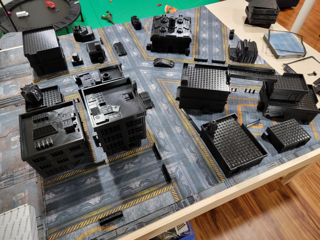 After I finish painting my initial batch of models, I’ll start in on the terrain. I have a full board printed out, but I’m continuing to print the needed scatter terrain to occupy roads, sidewalks, etc. One issue I’ve noticed is that any mat with a road is somewhat painful in the game. You want taller buildings toward the center as a general rule, so people can’t just deploy on top of them and they can help prevent full-board line of sight. Roads on mats tend to cross the center, which makes this hard to do.