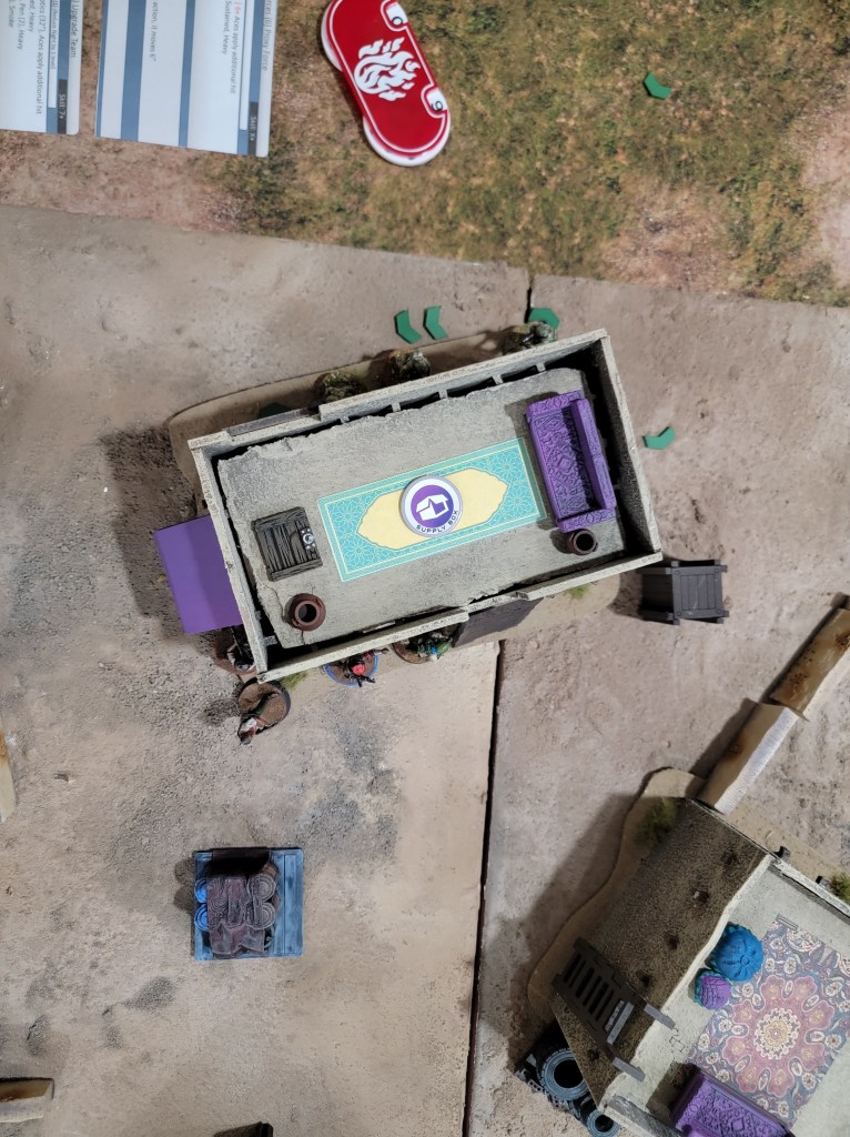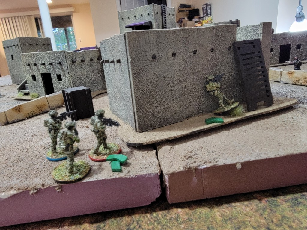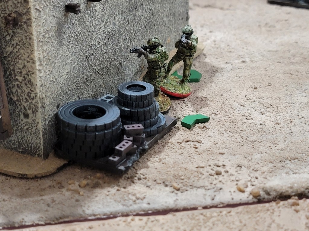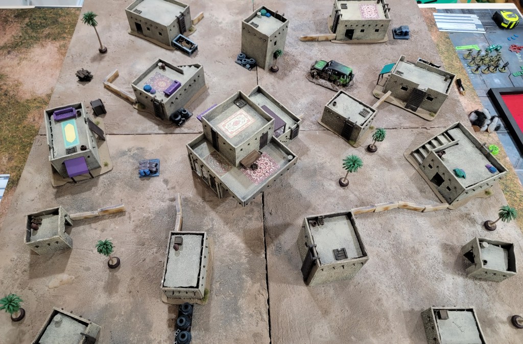 This feeds my suspicions that this ruleset is a good set of base tools upon which to impose other ideas. For example, I could have done an insurgency game by allowing the “local” player to hide their units inside buildings (but off board) and force the western player to go door to door. I could have had the game focus on a caravan escort with one side ambushing as they drove through town.