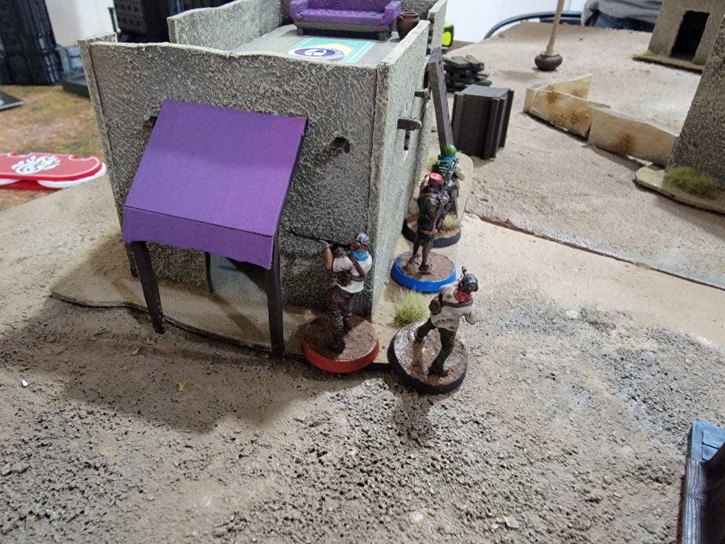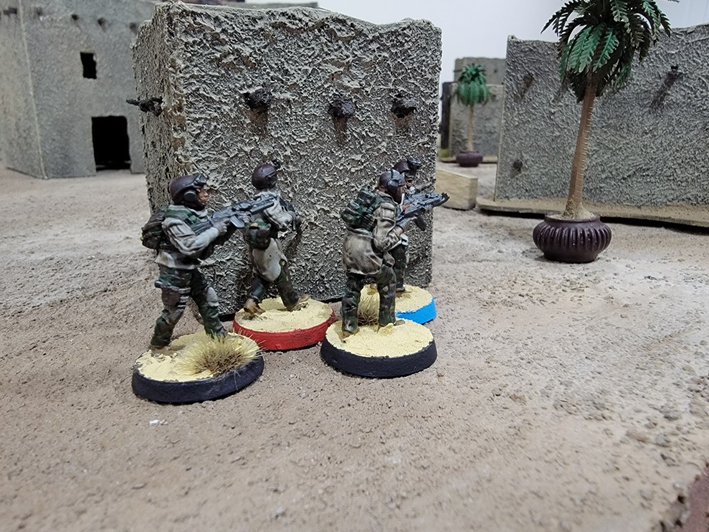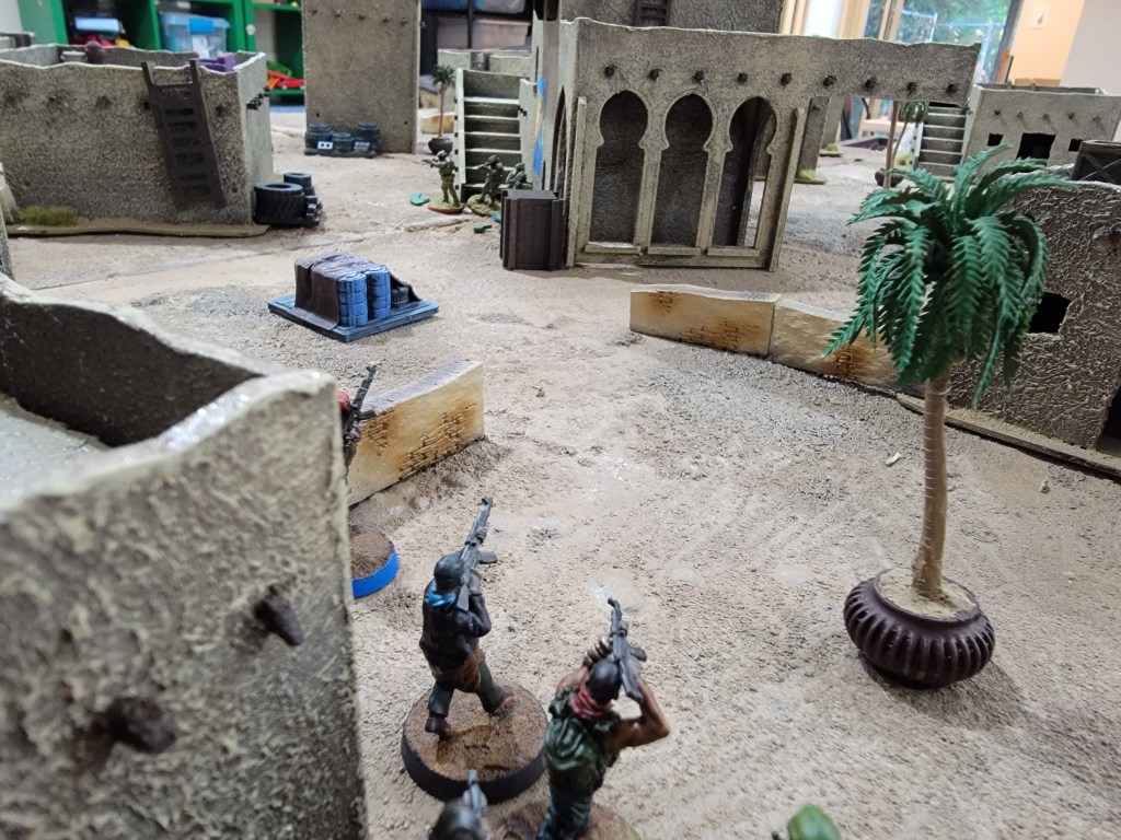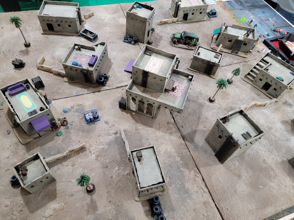 This feeds my suspicions that this ruleset is a good set of base tools upon which to impose other ideas. For example, I could have done an insurgency game by allowing the “local” player to hide their units inside buildings (but off board) and force the western player to go door to door. I could have had the game focus on a caravan escort with one side ambushing as they drove through town.
