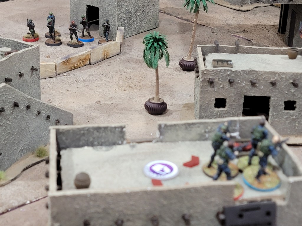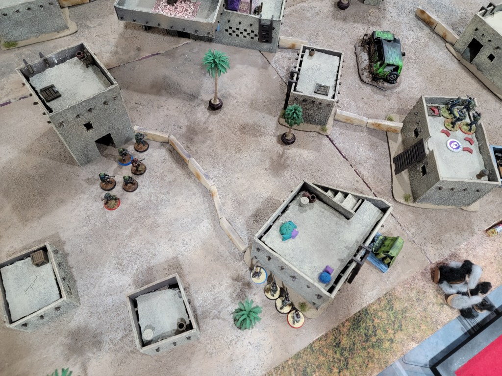 My match itself went well. My opponent played three squads of Tier 2 Commandos and I played a set of Tier 3 Locals with a unit of Advisors. We tied after a very tense end game conflict over the western objective (from my perspective in the photos). I managed to land the exact right grenade and win a competing shooting roll that allowed me to take the objective after having been pinned down repeatedly by his LMG fire throughout much of the game.