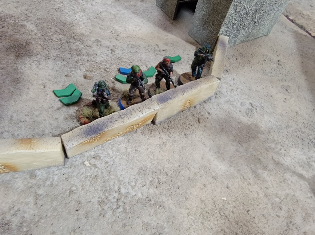 Playing a Tier 3 force proved an interesting challenge. I had more bodies, but he recovered injured models more often and I missed more shots. The 10% difference in skill (6+ for Tier 2, 7+ for Tier 3 on a D10) really added up across the various rolls. Not to mention I spent most of the game pinned because my forces kept failing the check when they lost a model. This delayed my action repeatedly in a way that caused me to play more cautiously.