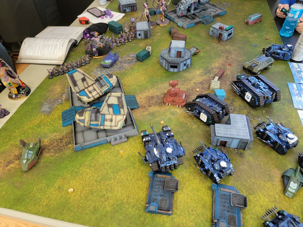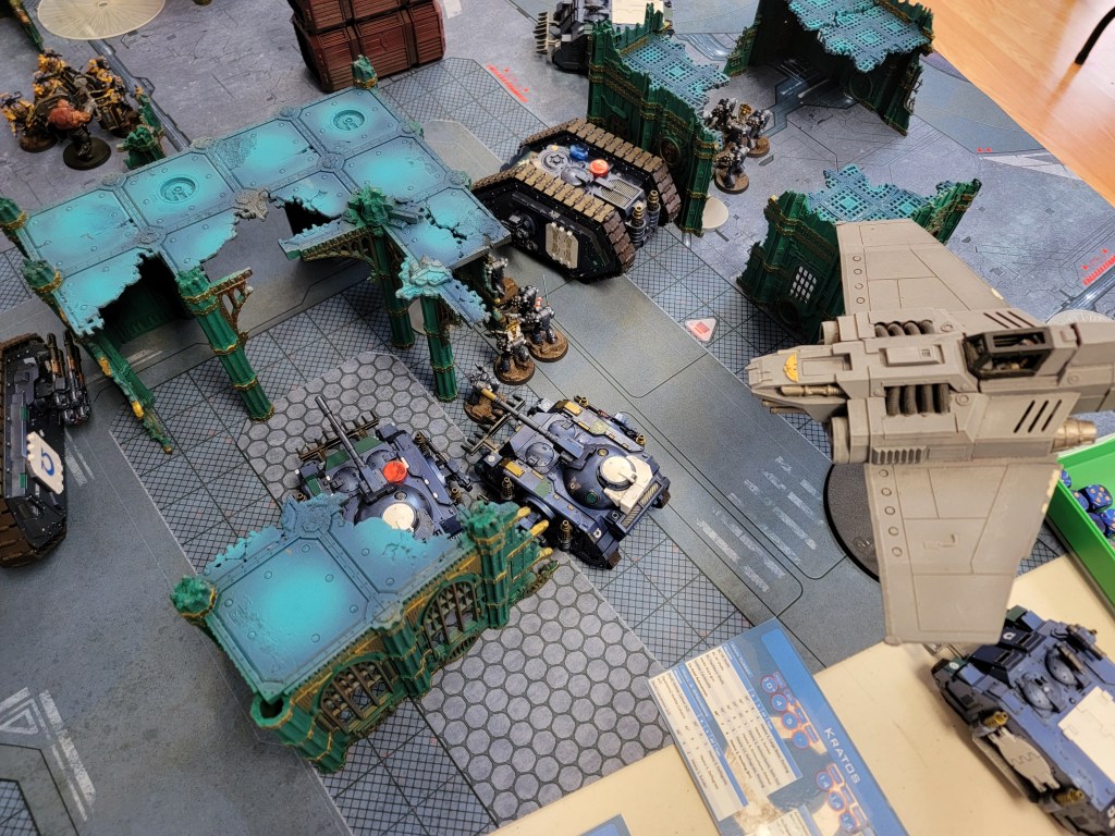 So off the cuff there’s a few things to note. I lack any dreadnoughts, lascannon heavy squads, or other classically “Good” units. My terminators have lightning claws, making them particularly good at killing normal marines—a target they haven’t seen much of. My Suzerain are good anti-elites, sometimes great depending on target. The predators can really output some harm but die really easily. The Kratos and Spartan tend to make it halfway through the game before getting immobilized or killed.