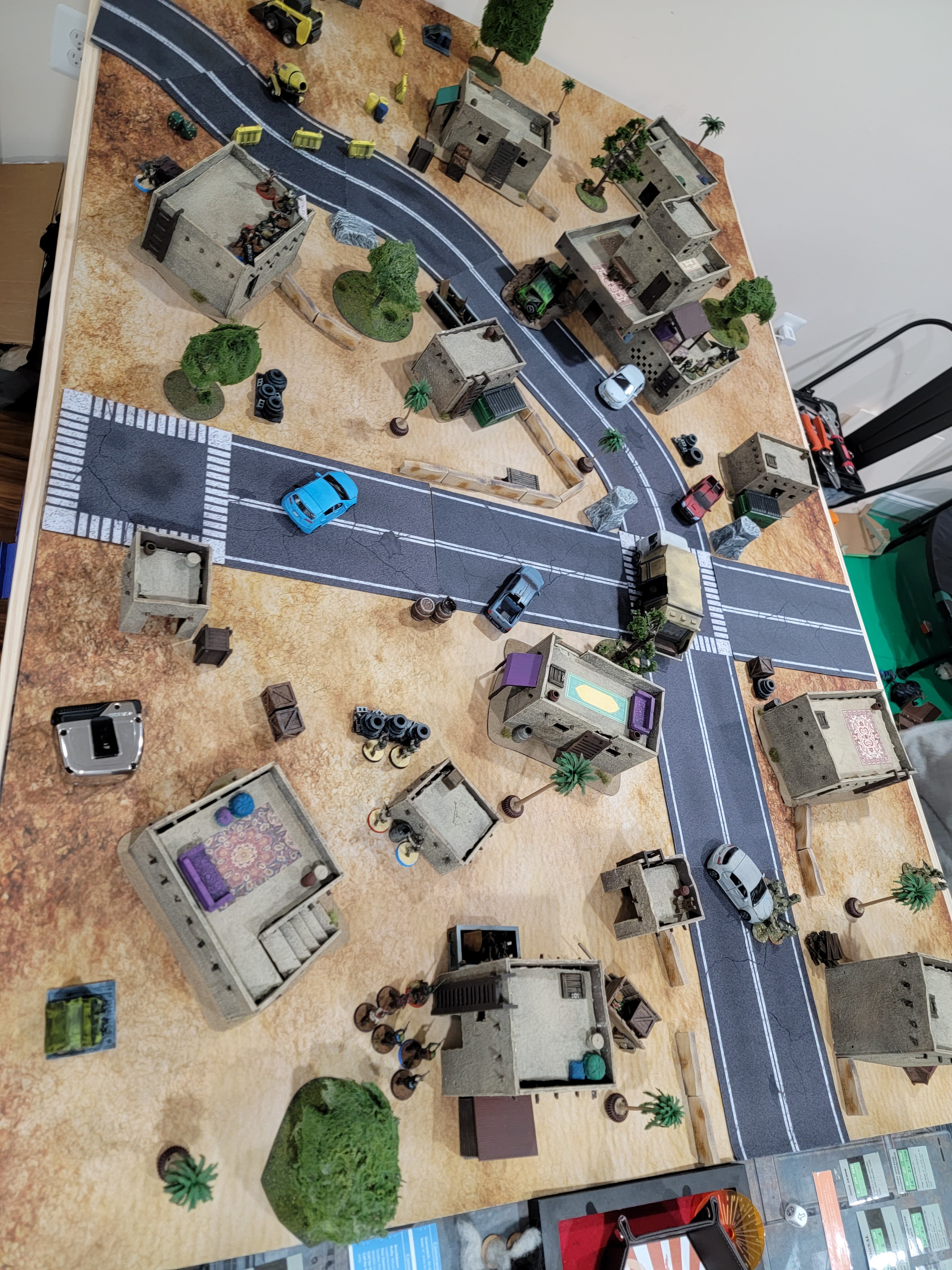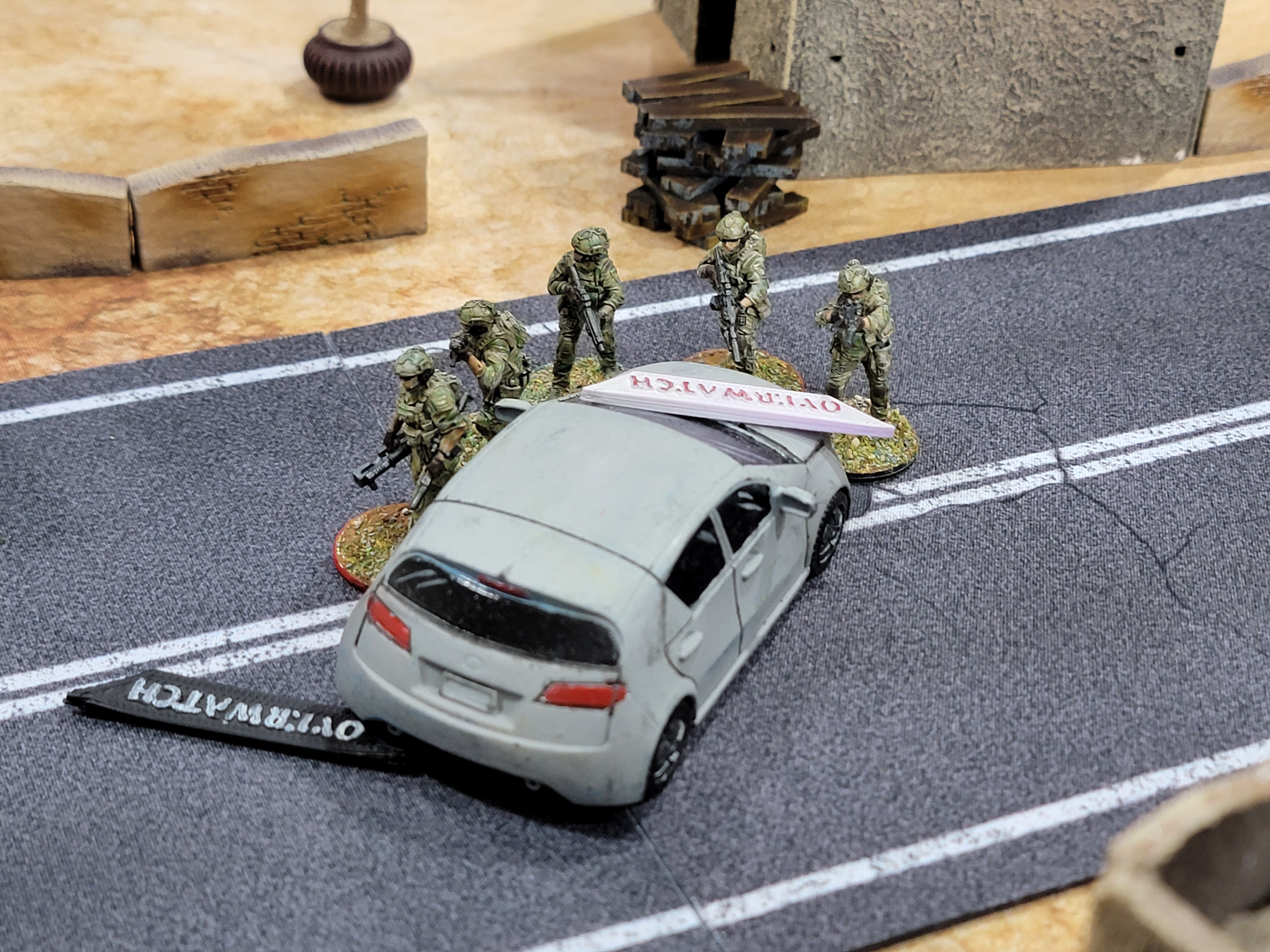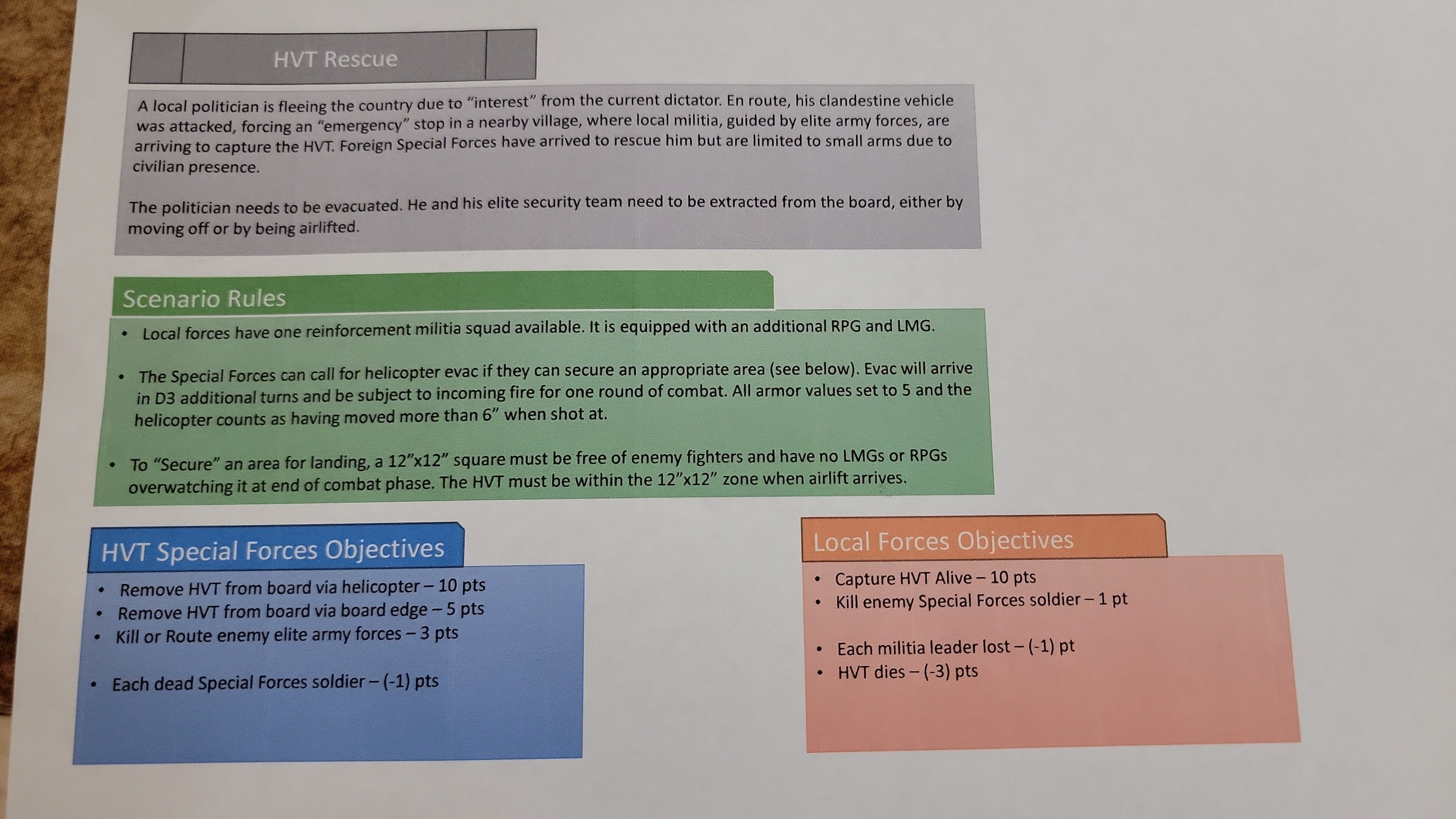 Anyway, I got to play! I setup a scenario with two ground forces, no off board support, and various vehicles that could be captured and used on the board. The goal was for my opponent to rescue a High Value Target and call for a helicopter to pick him up. Here’s the scenario as I wrote it: