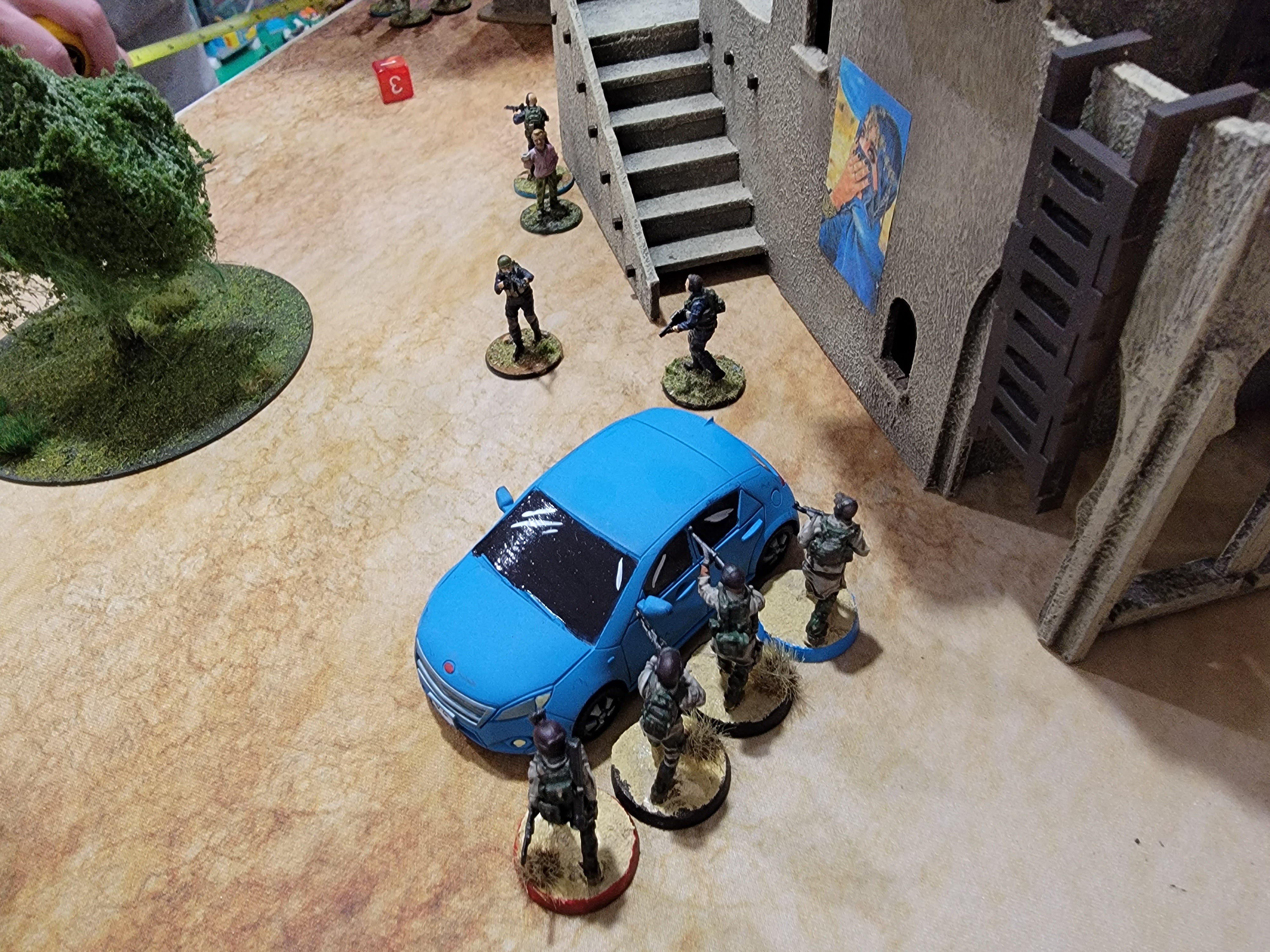While he did successfully lock down one flank with a unit on overwatch, I managed to run a unit up the other flank to devastating effect. They rounded the corner and took out the entirety of the security team around the HVT.