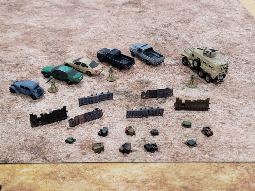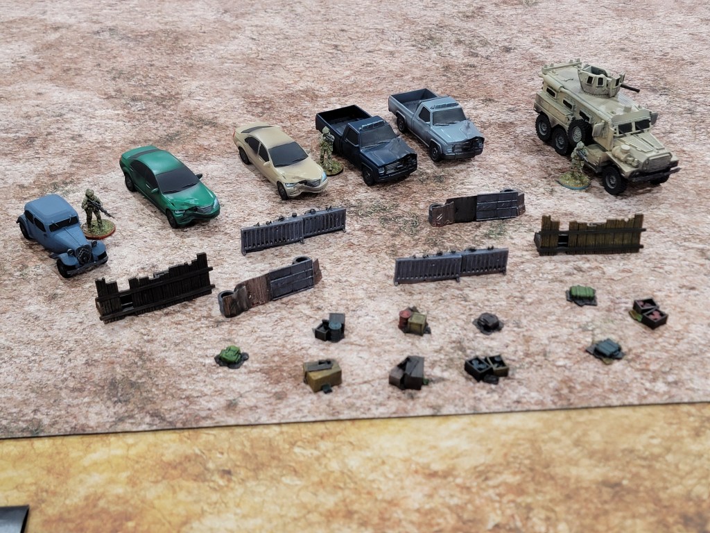 With my Blacksite Studios terrain coming in this week, I decided to continue chipping away at modern scatter terrain. Earlier this year I picked up a box of Terrain Crate: Street Scatter. I had been looking for affordable cars in the appropriate scale for my modern games, only to find that they’re much more expensive than I’d like. For $30 (discounted) this kit gives you two cars and two pickup trucks with some minor collision damage alongside small scatter and a few barricades. It’s not “Cheap” per se but rather a good price.