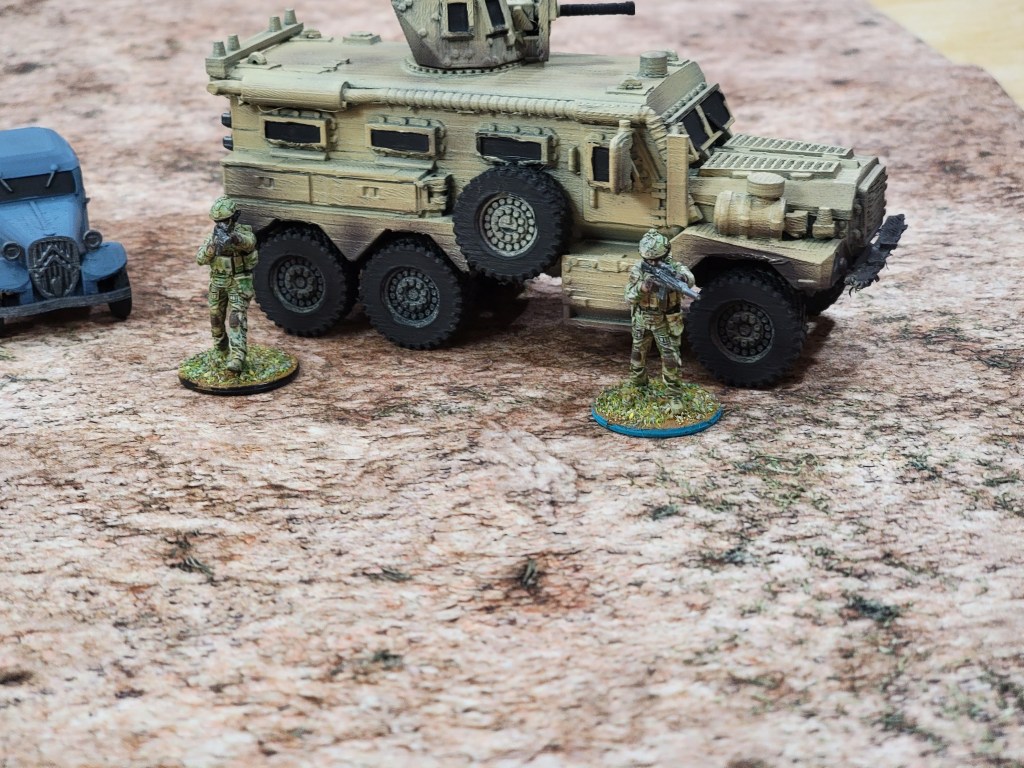 Next up was an experiment. I wanted a Cougar MRAP for Asymmetric Warfare but found that the few kits I could find online were $30-40, which is just more than I want to spend for a small side project. I gave 3D printing a try with my PLA printer (plastic—usually used for terrain, not miniatures) a try. I must admit some parts could have been better supported (my fault). The final piece looks more than good enough for tabletop, though, and I feel encouraged as a result.