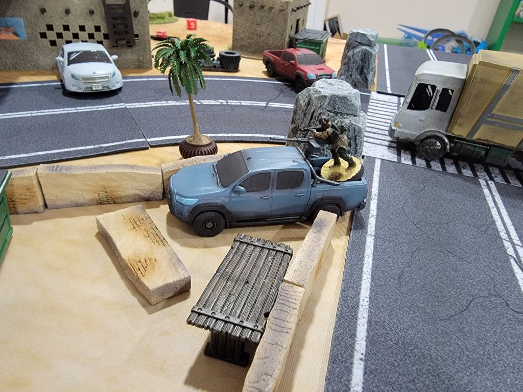 Based on the rules, the best a carbine can do to my truck is M-Kill it (stop its movement, but not destroy it). He rolls his shot and gets “Driver Hit” as the result. This causes the vehicle to drive in a random direction, which further causes it to crash. I roll and find that my driver is killed by the shot. I then roll on the collision table and find that my vehicle is now nearly immobile after the crash.