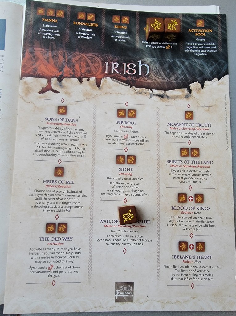 In SAGA, your activation is controlled by a roll of the dice and their subsequent placement onto your battle board. You roll your SAGA dice (one per living unit on your side) and assign them onto the board between Basic Activations (which grant a unit the ability to move, shoot, charge, rally) and Advanced Activations (which buff or debuff units). This creates a Command-and-Control model in which you have imperfect control over not only your units, but their capabilities. As your forces die off, you lose SAGA dice and reduce your ability to control your forces as you want.