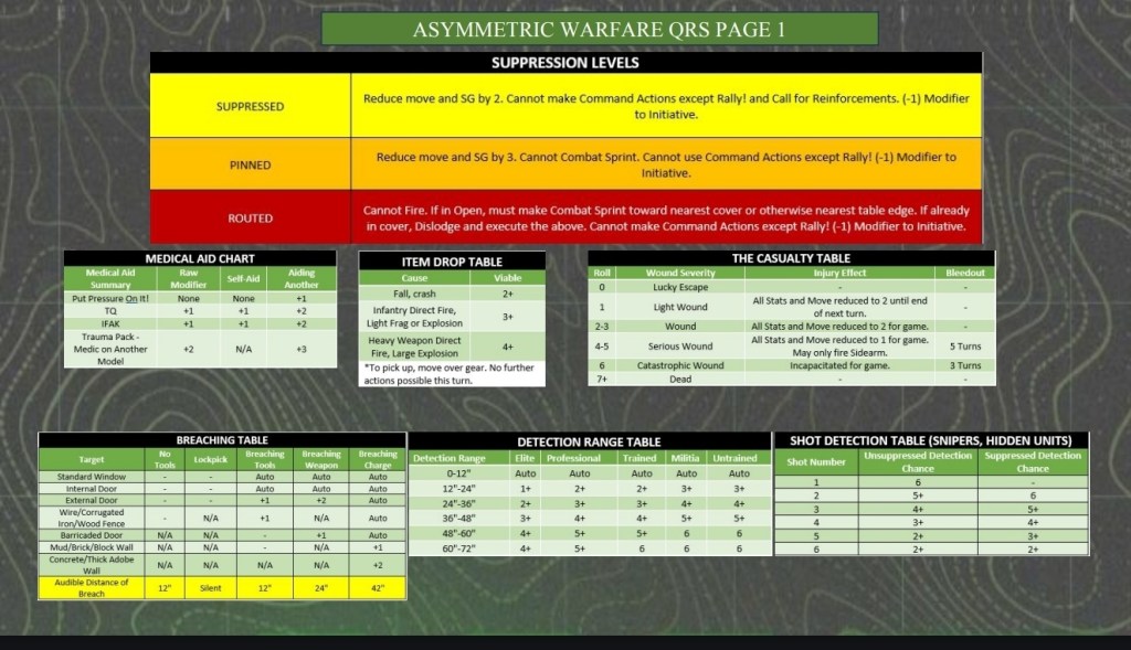 The quick reference is straightforward. I tried to collect every chart in the book and throw them onto two pages. It does not explain how to play in any capacity—it’s just saving you from looking up tables. The first page is all Infantry related tables and the second page is the two Vehicle tables. Print it front and back and Bob’s your uncle.