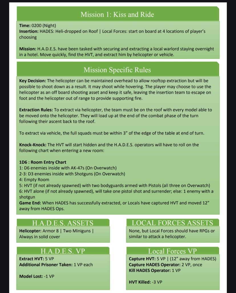 It’s worth noting that I don’t include strict force structures at all. Everyone’s collection varies. The missions are meant to be varied and some have specific terrain requirements. I didn’t make the packet for accessibility but rather variety. Use it as a jumping off point. This game takes experimentation and is far from perfectly balanced. I’ve included a fair bit of randomness and I have not designed these to be balanced, but interesting. Have fun with them and modify as you go.