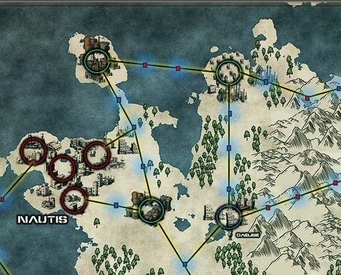 Cities are the victory conditions for the game and affect your will to fight—losing or capturing cities knocks you up or down a level. Cities and Towns are points of supply: an army must be within ten nodes of a city or town (or a constructed forward base) to be considered “In Supply.” Logistics nodes provide no supply as they represent raw materials, not end-product factories. You need them to generate the Warchest Points that fund your campaign level actions.