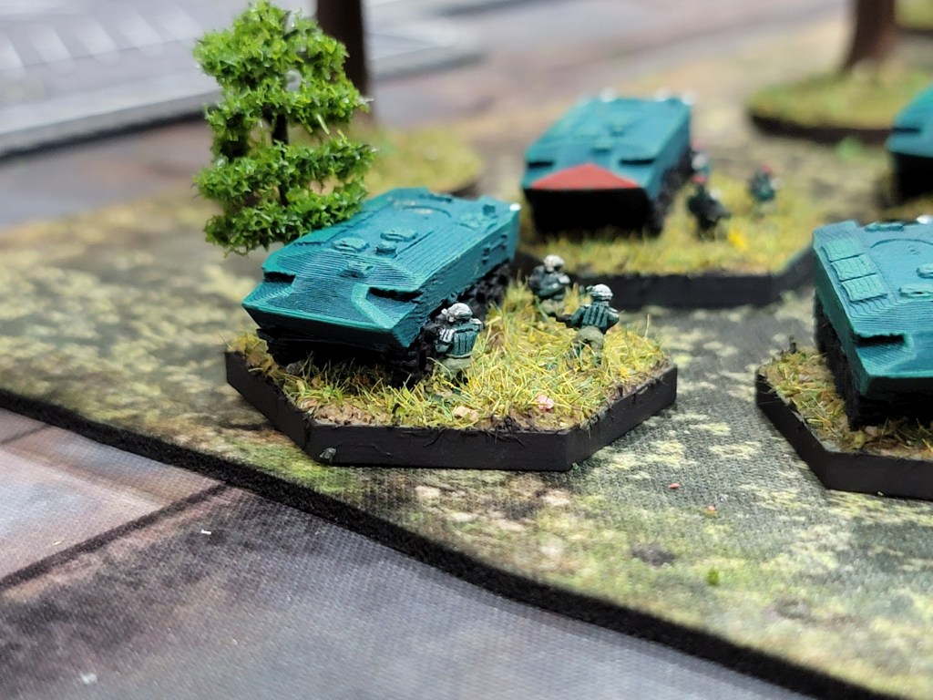 One thing I like about science fiction is the ability to get creative with basing and theme. Here, I stuck to fairly safe ideas: roads, parking lots, cars, and greenery. I had fun adding trees and cars for scale and I think it worked out quite well, but as a predominantly historical gamer, I feel the need to do more outlandish things.
