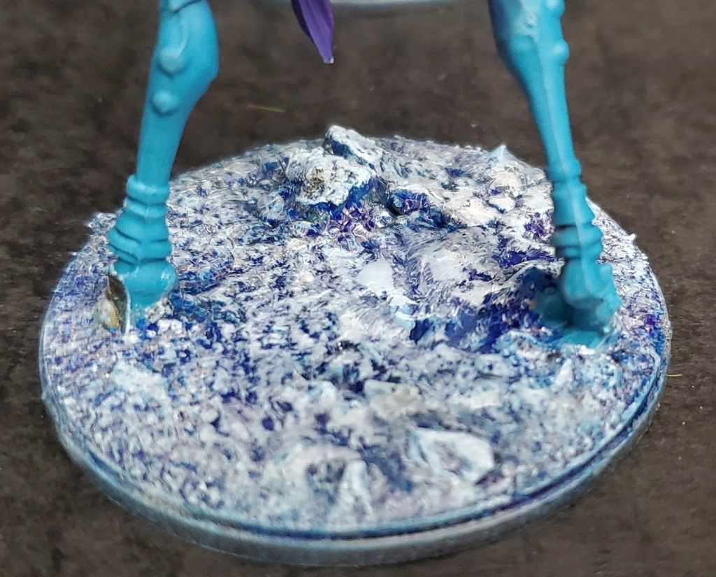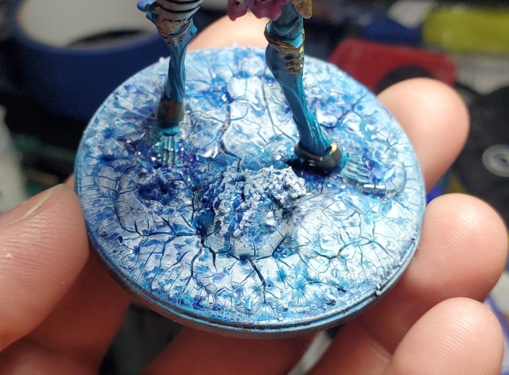 It was deceptively easy–I glued a lot of grit and rocks down, then painted them deep blue. After that I applied a crackle gel and dry brushed it white after drying. It was impactful and I’ve wanted to try my hand at it again for years. The deep blue should hopefully help it stand out against the white mechs.