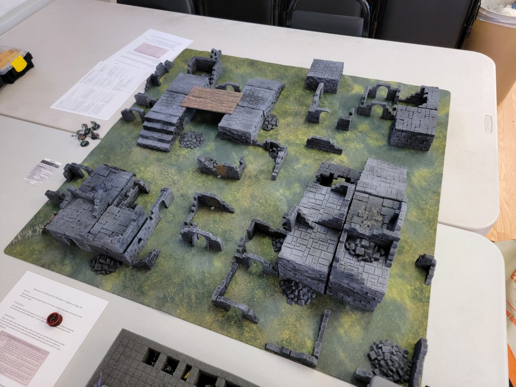For this event, I used the base scenarios from the book, lightly modified to fit the terrain I had on hand and to have clearcut end conditions so as to end the games a little faster. I find having to run all your models off the board or having to declare an end cooperatively with your opponent to be an unnecessary burden.