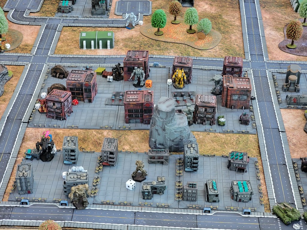 The rules are simple at their core: you want credits to win. You earn credits by killing opponents or standing in the 2 foot square center of a 6 foot board. Each player gets a lance and can spend their credits to respawn mechs at random locations. Players can also freely exchange credits for deals with other players. The game used card draw for single unit activations (in effect, chit pulling). Tanks, VTOLs, and infantry are allowed alongside mechs, but each player can only bring four units valued at 150 points.