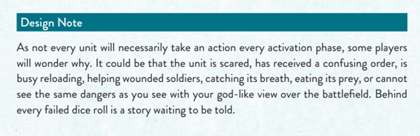 As a designer your commentary matters. When you offer an explanation for a mechanic, you give the players your reasoning. Friction is especially important to explain. Players don’t generally like to be told they can’t do something—unless they understand it to be a reasonable part of the reality of battle. Give a poor explanation and you end up with a folks rejecting your game because they don’t like how ‘unfair’ or ‘unrealistic’ it is.
