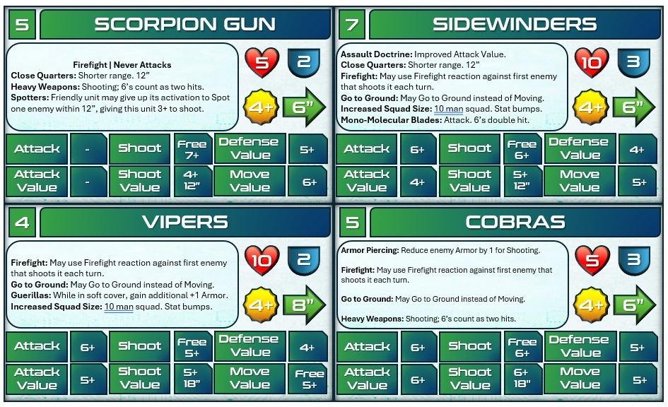 My son and I have a bit of a world coming together. He named his units with Draconic theming and chose power armored soldiers as the bulk of his force. I went with a desert force of ragtag soldiers. Clearly, we’re resisting the dragon lords from our desert wastelands. I went with snake theming to name my infantry in an effort to feel like slippery guerrilla fighters and to contrast his dragon names (“Flame Drakes” being his main infantry).