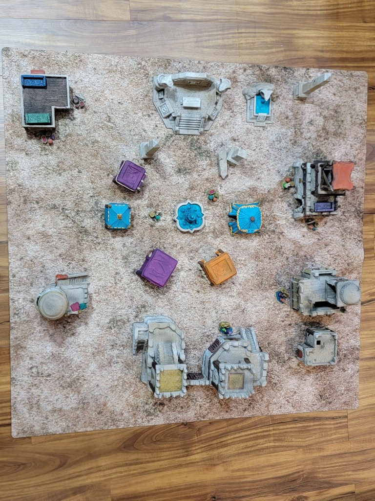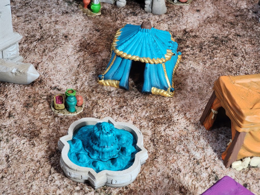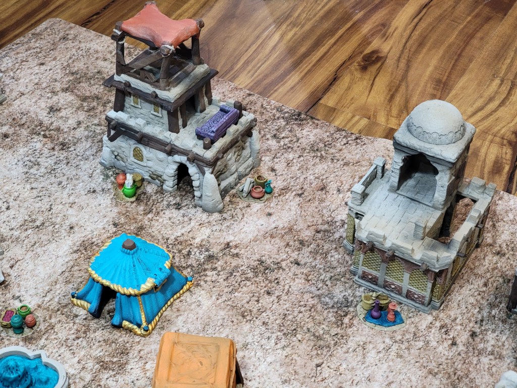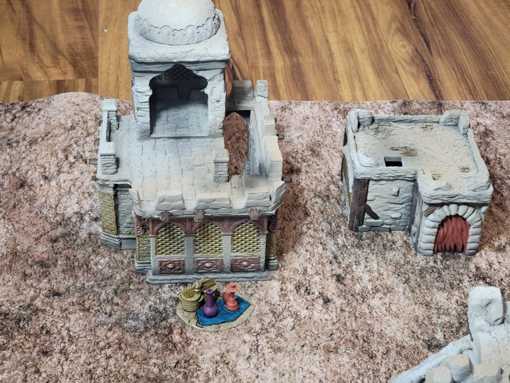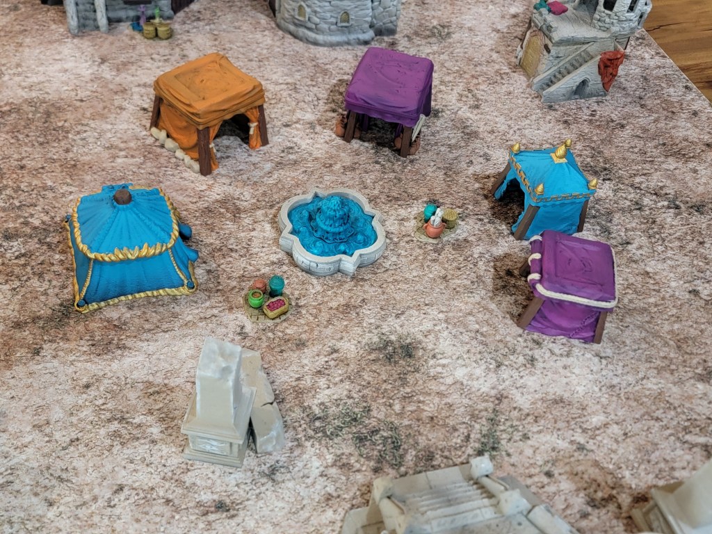 I like the contrast of colors with the tents and scatter. It provides just enough pop. I have rocks I can add in that are reddish brown and once it’s all together I’ll have a pretty great board or two for fantasy deserts.