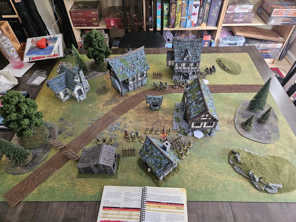 The other reason it tempts me is that it does what SAGA doesn’t with narrative play. A game of Baron’s War just looks like a game I want to play. SAGA is fast, mechanically satisfying, and easy to play. It may win out just because it’s a perfect game for someone on a limited schedule. SAGA just… delivers. Unfortunately, to play it properly you’re laying out very boring looking boards. Trees, swamps, clearings. It makes sense: battles are fought in open areas. Yet Baron’s War does so well with tables full of buildings, fences, and life that gosh if it doesn’t call to me.