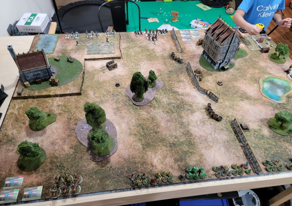 Well, I reworked the name! I wrote out the remainder of my alpha ruleset for With Shield and Courage and actually managed to get a few games in. As a reminder, it’s a warband size (30-50 models) wargame of early to mid medieval era combat where leaders and combat stress matter. The goal of the game isn’t entirely to make a game but really for me to explore the idea of a medieval warband game and see if you can straddle the line between a recreation of the real decision making on the ground and… well, having fun. I suspect most games in this space end up stapling on additional systems because the actual tactical decisions of a “warband leader” were not that interesting. I hope to be wrong, because 30-50 dudes is the perfect size for a painting project!
