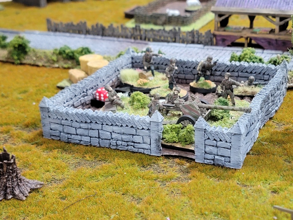 Per the fields: they were very effective and often occupied by troops. I originally thought I’d add crops to them by drilling some holes and putting some stalks into the dirt–now I realize we wouldn’t have occupied them as much for fear of harming the terrain piece itself. No, if I add any greenery it’ll probably just be small scatterings of flock to give the impression of sprouting crops. That way, you can safely put whole squads inside them–or as will be seen in my “On the Field” post later this week, a whole section alongside an anti-tank gun.