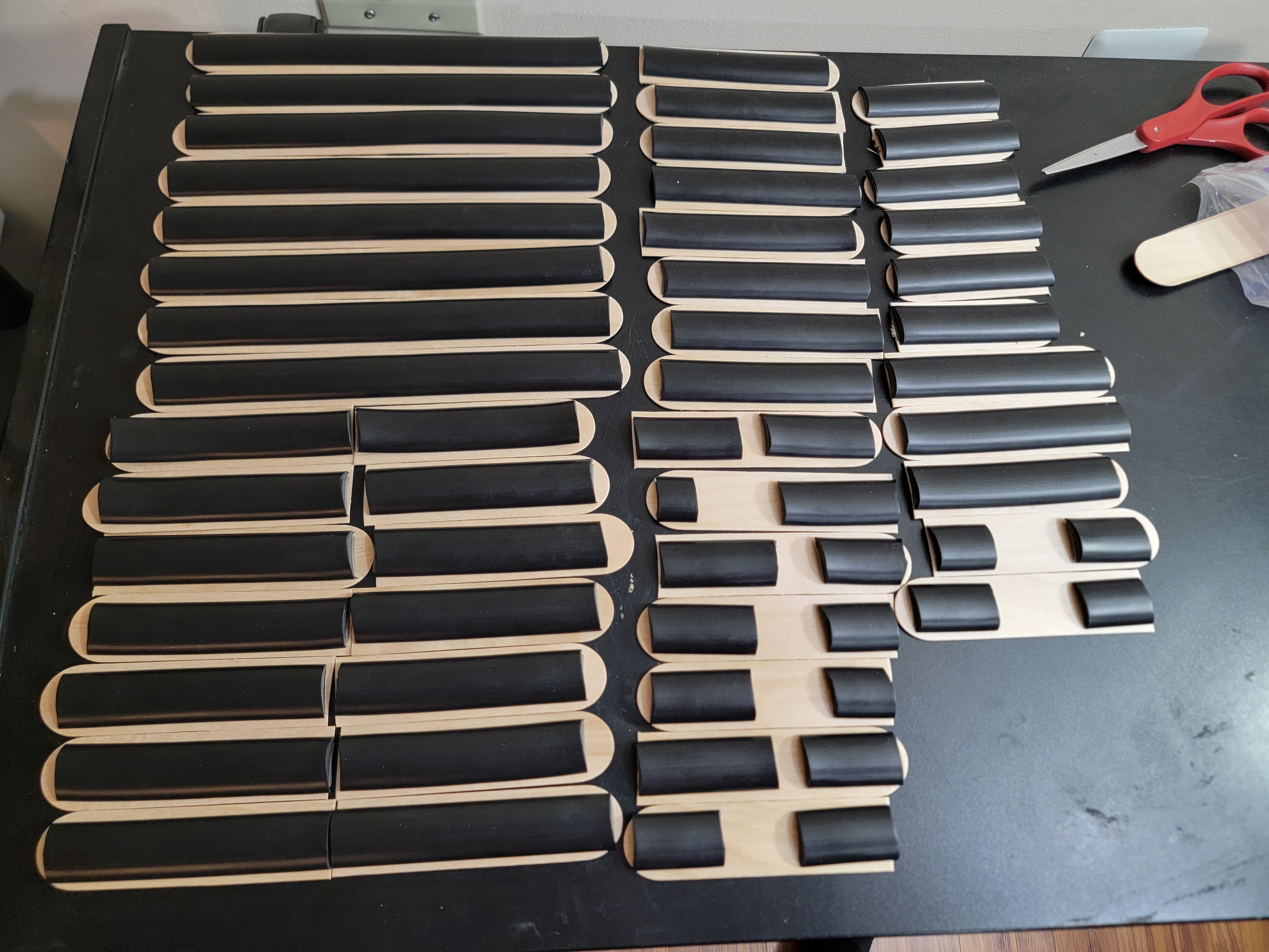 So the general process here is simple. You’re going to cut the rubber to the sizes you want, glue those to the popsicle sticks, then prime/paint brown, then flock. After this you use the glue mixture to soak everything, let it dry, and repeat as many times as you can tolerate.
