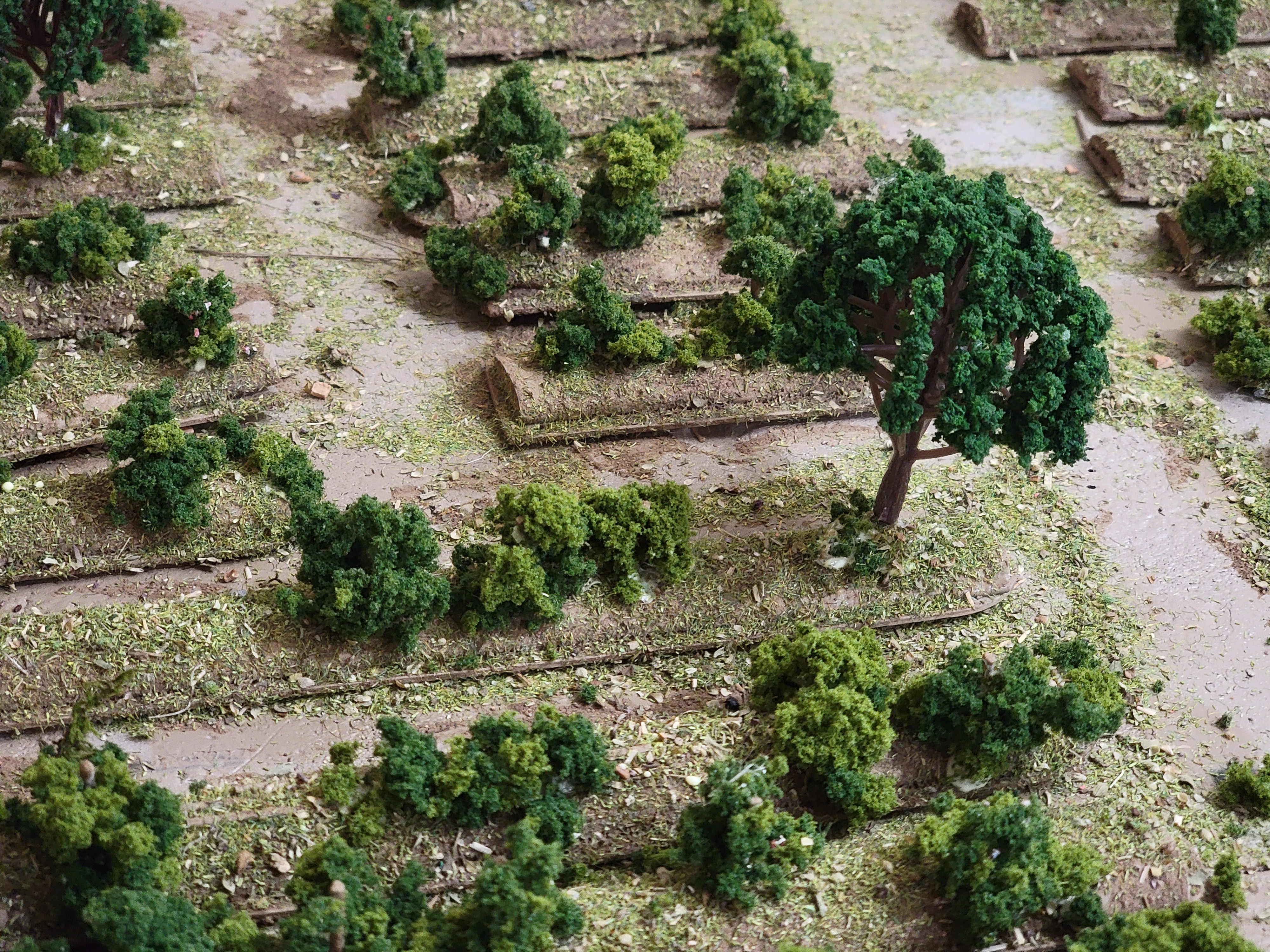 3. Trees: I’m using H/O scale railroad trees of varying sizes. As I intend these to work with both 15mm and 28mm, I tried to skew toward smaller trees, which will be ‘big’ in 15mm and ‘small’ in 28mm.