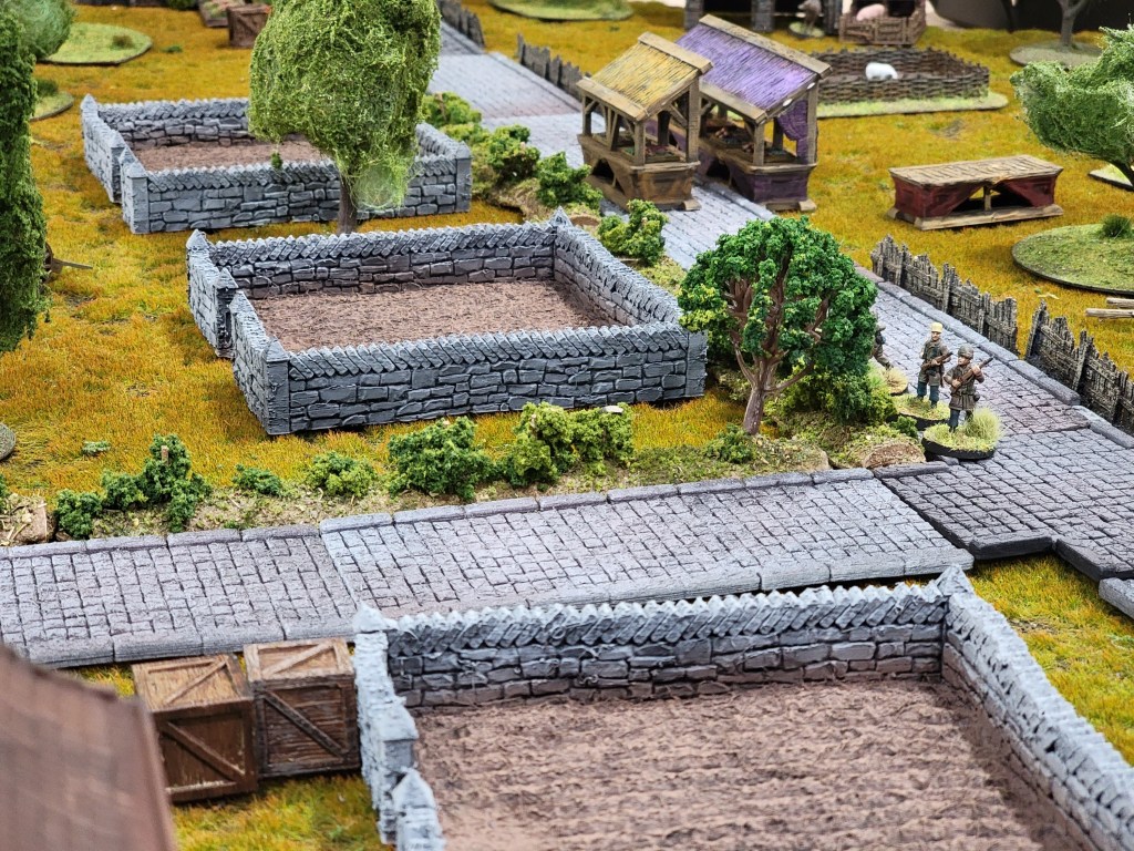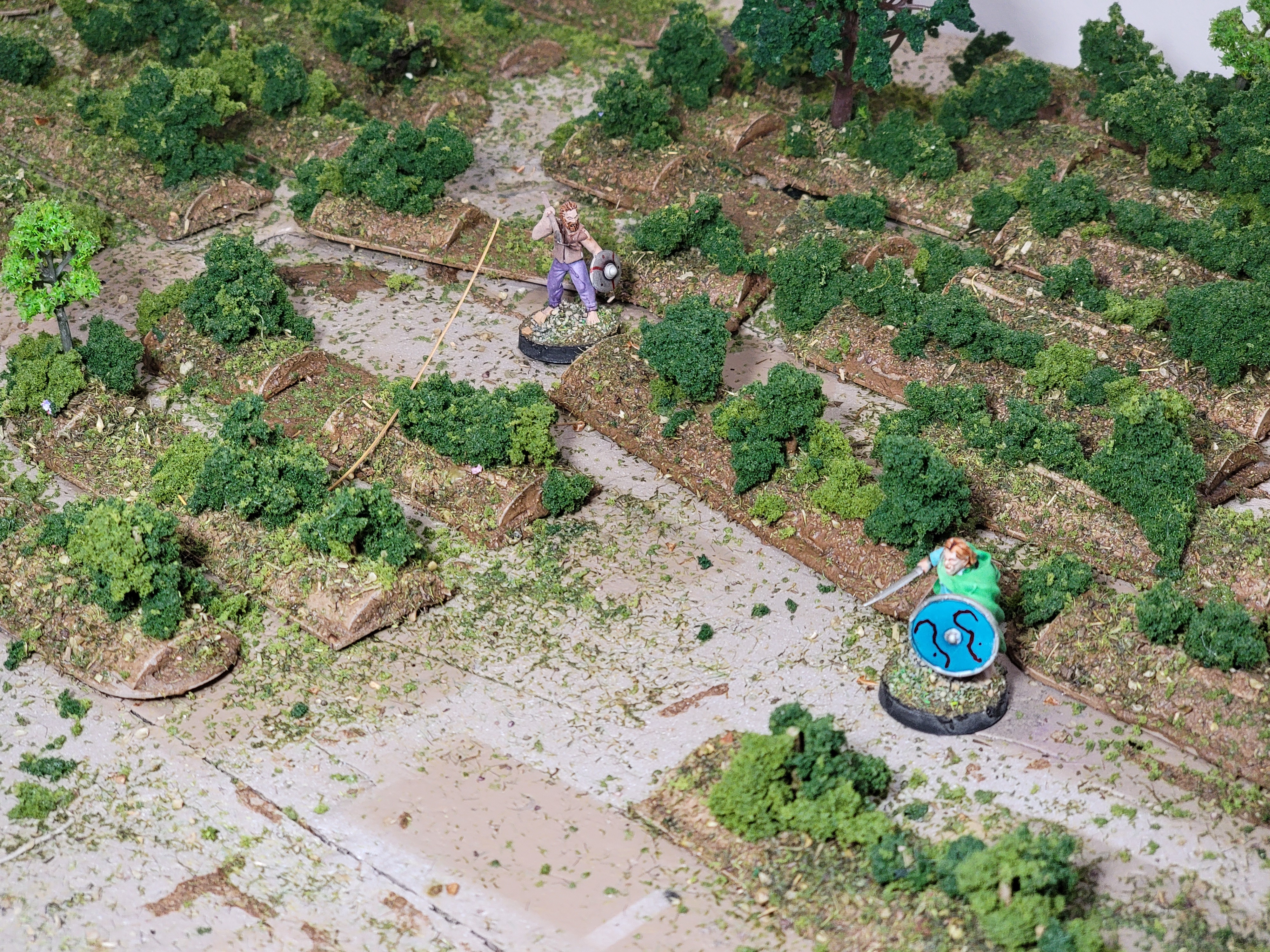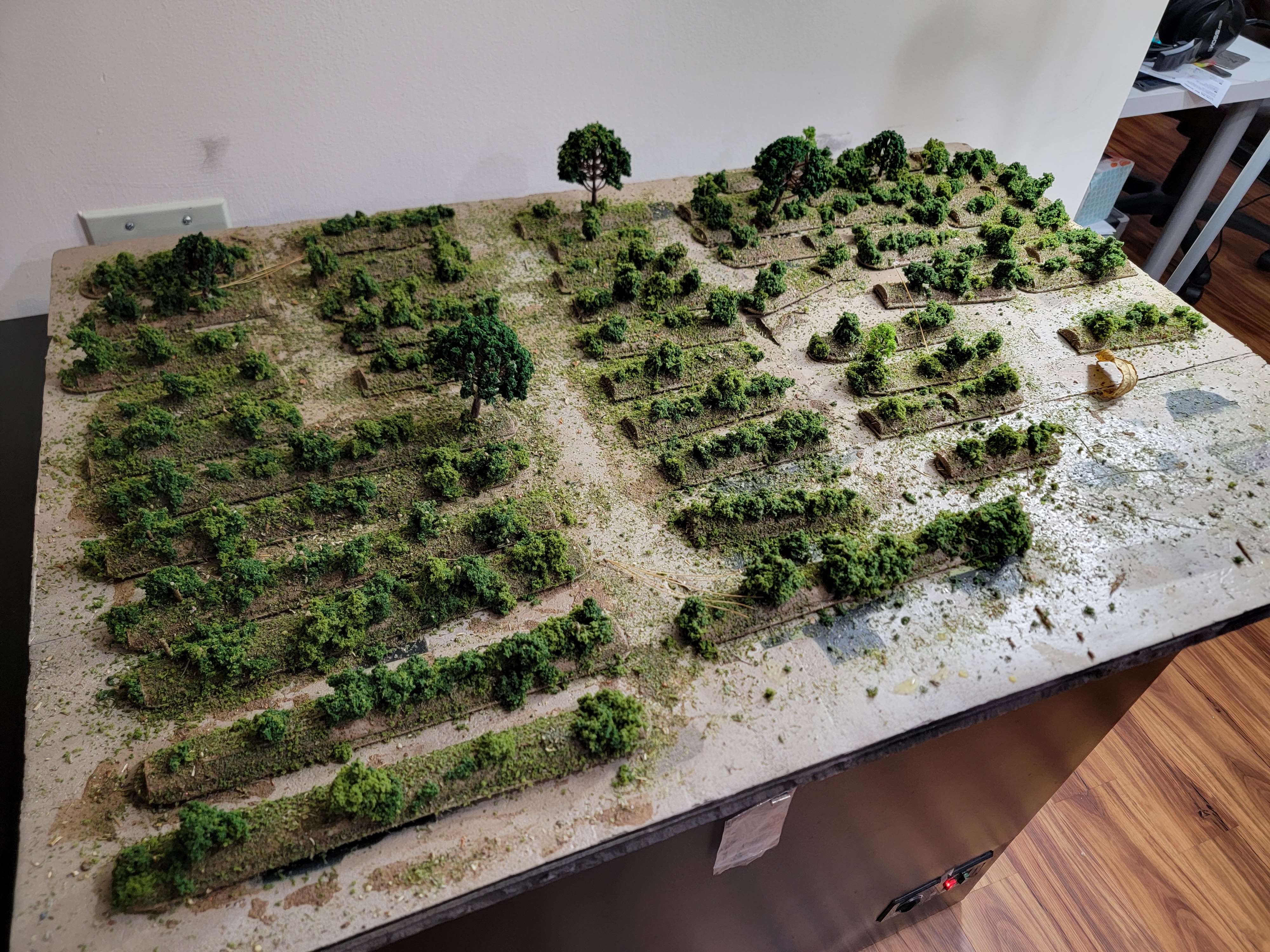 Here’s a few photos from games I’ve played to give you an idea of these in action. They’re far from perfect but as I’ve used them, they’ve grown on me. I think if I went a little crazier with the clump foliage they’d look a lot better. The project overall cost me about $40 in material for 20 feet of hedges. I’m mixed on this–that’s a lot for an okay product. I had actually considered buying prefab hedges but now I see why their prices were so ridiculous. It’s hard to make this product and really have it look good. The same amount of hedges could sell for $200 online. I get that now.