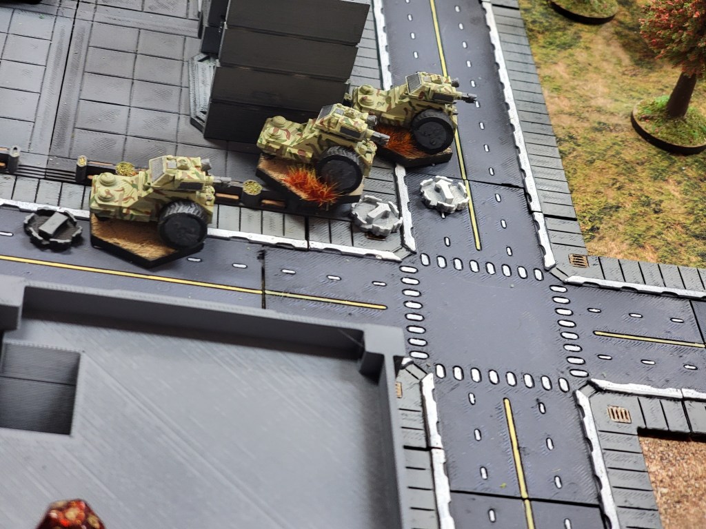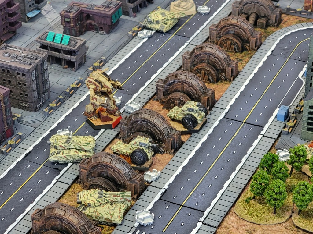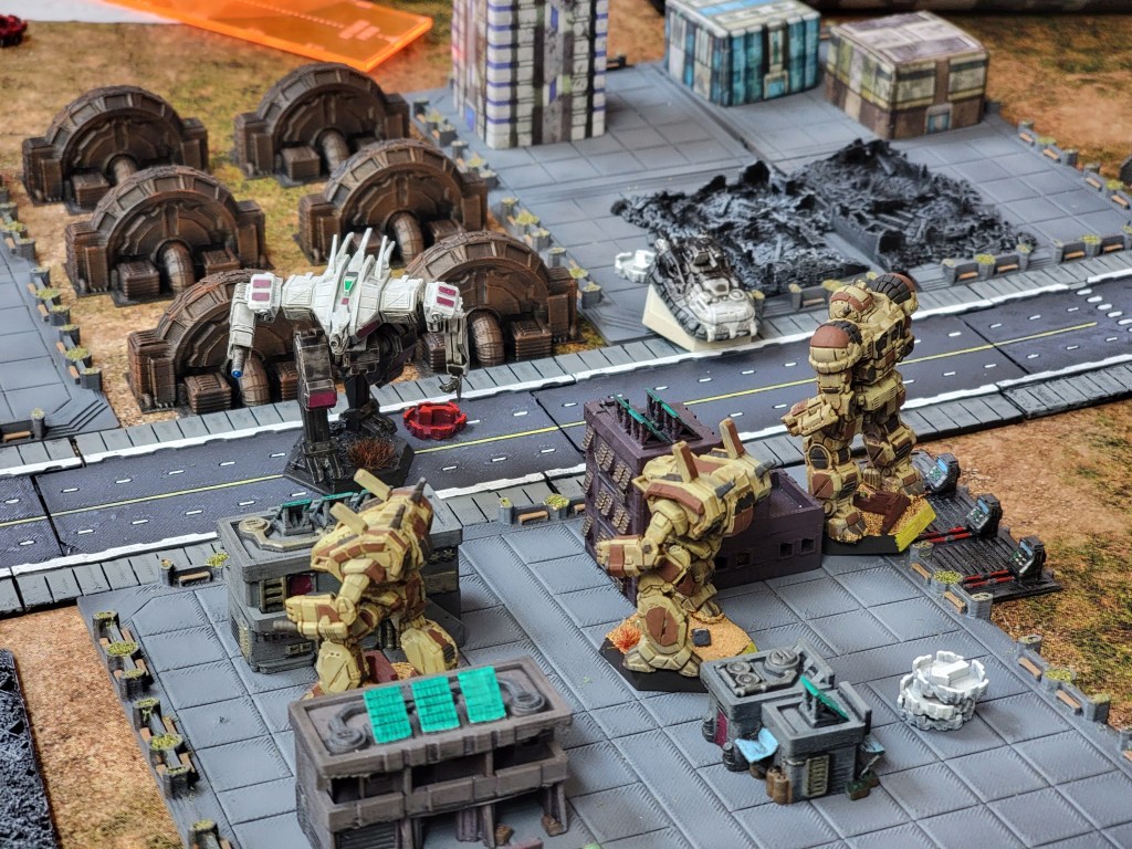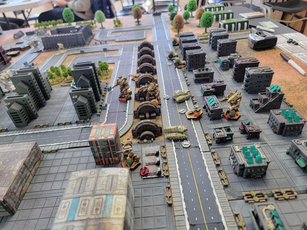 And what a good set of games we’ve had. My opponent is trying to make big elite mechs work for him but struggling against my more broad list. Meanwhile, I’m just rolling in ridiculous straight shooting tanks and having a ball blowing up half the board. Literally. Last game I found that I couldn’t shoot him because he was hiding behind buildings all the time. My solution? Shoot the buildings! Can’t hide behind open air after I’ve pummeled a major apartment building into scrap.