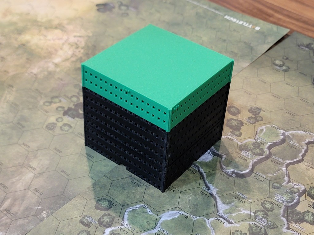Suffice it to say this is very Battletech. I’ve had so much fun I decided that for our upcoming family vacation to Canada I’ll be bringing some terrain and mechs along to play with my son. I went and designed a nesting set of terrain such that I can fill up a board while using as little storage space as possible. Everything packs into one 4″ building. Two of these buildings readily fill a 4×4′ board to a reasonable extent. I’ll be releasing the basic buildings for free and then expanding the set with public parks, roads, parking garages, public squares, and whatever other features I can get to work in this simple format. The idea is: easily printed, painted, and stored terrain.