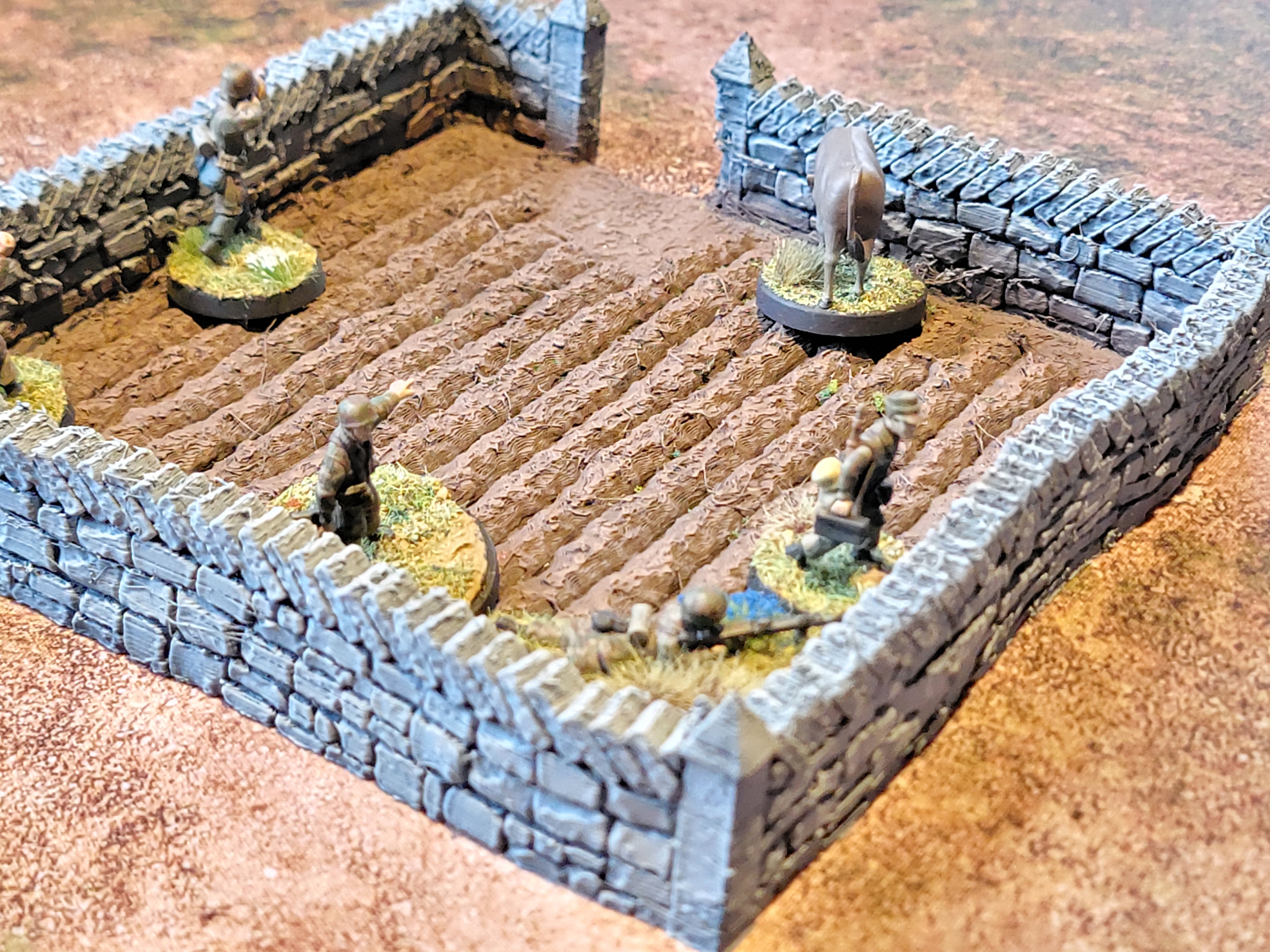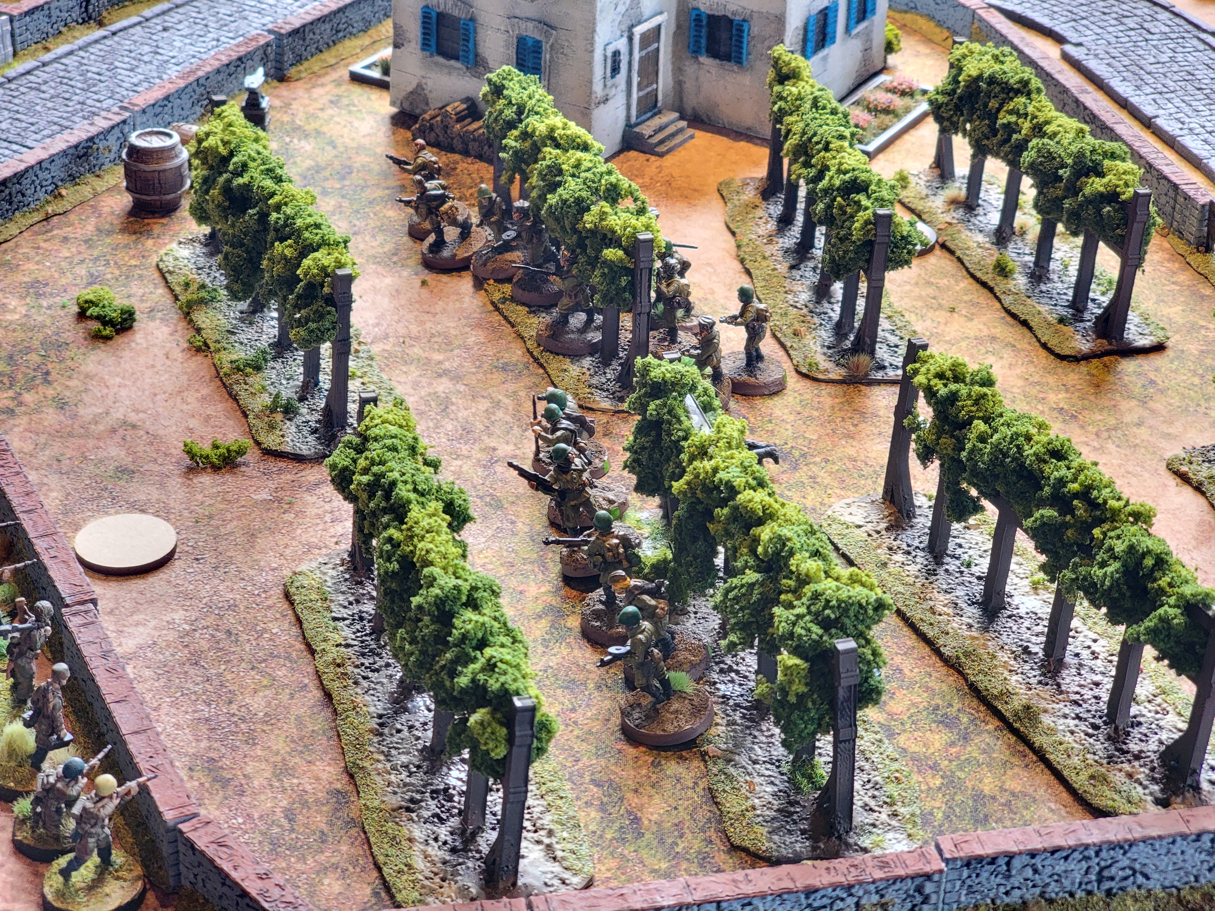 Unfortunately, I ran into defenders in the orchards and the houses which slowed me to a crawl. In the image earlier, you can see some men in a field surrounded by a stone fence–they were already hunkered down and holding on for relief. Just one good At the Double away from getting off the board and they couldn’t make it any further. On the other side I managed to get a little farther along, but my opponent used the orchard to hide away two whole sections ready to force me to charge them or die to shooting.