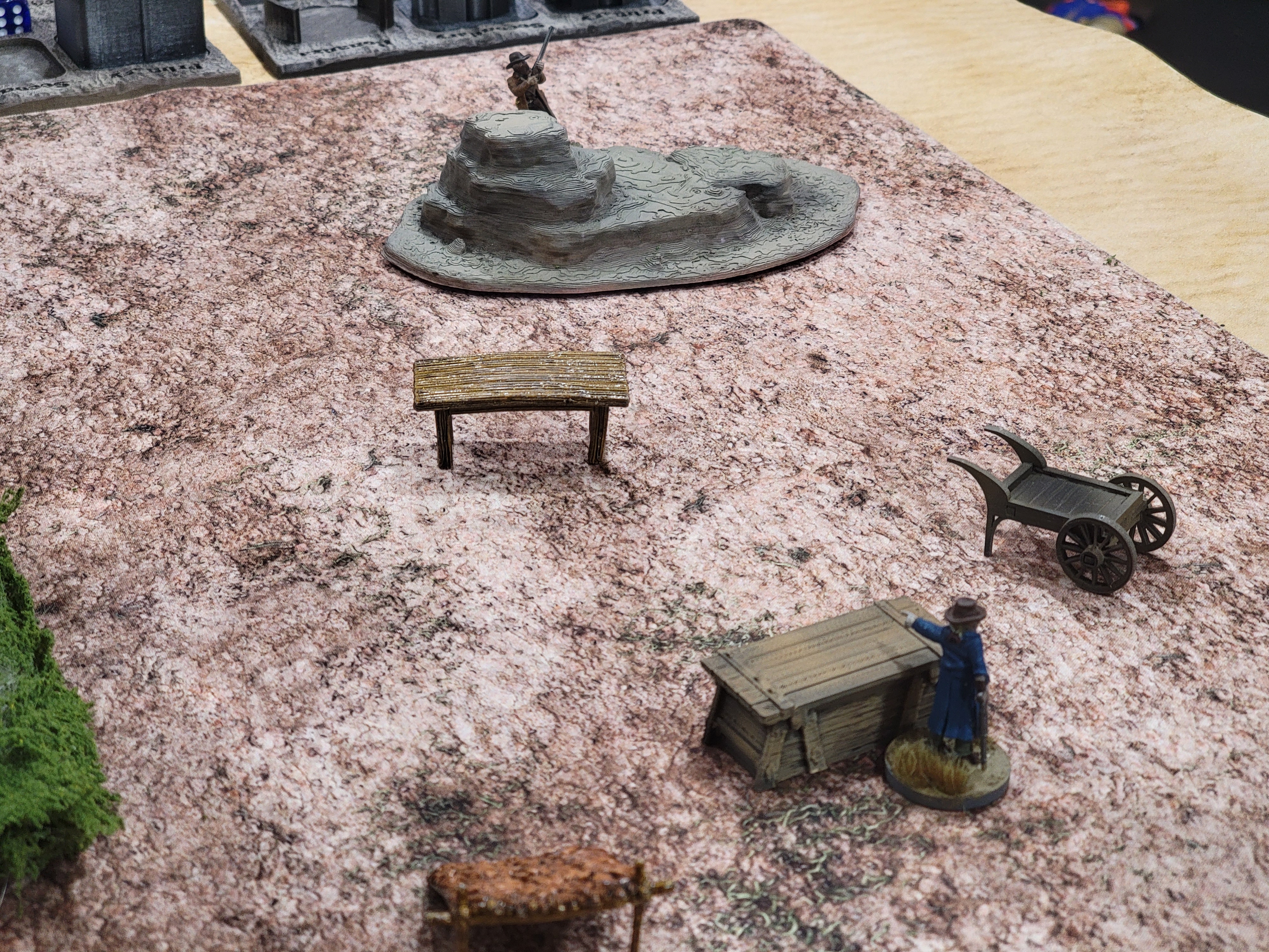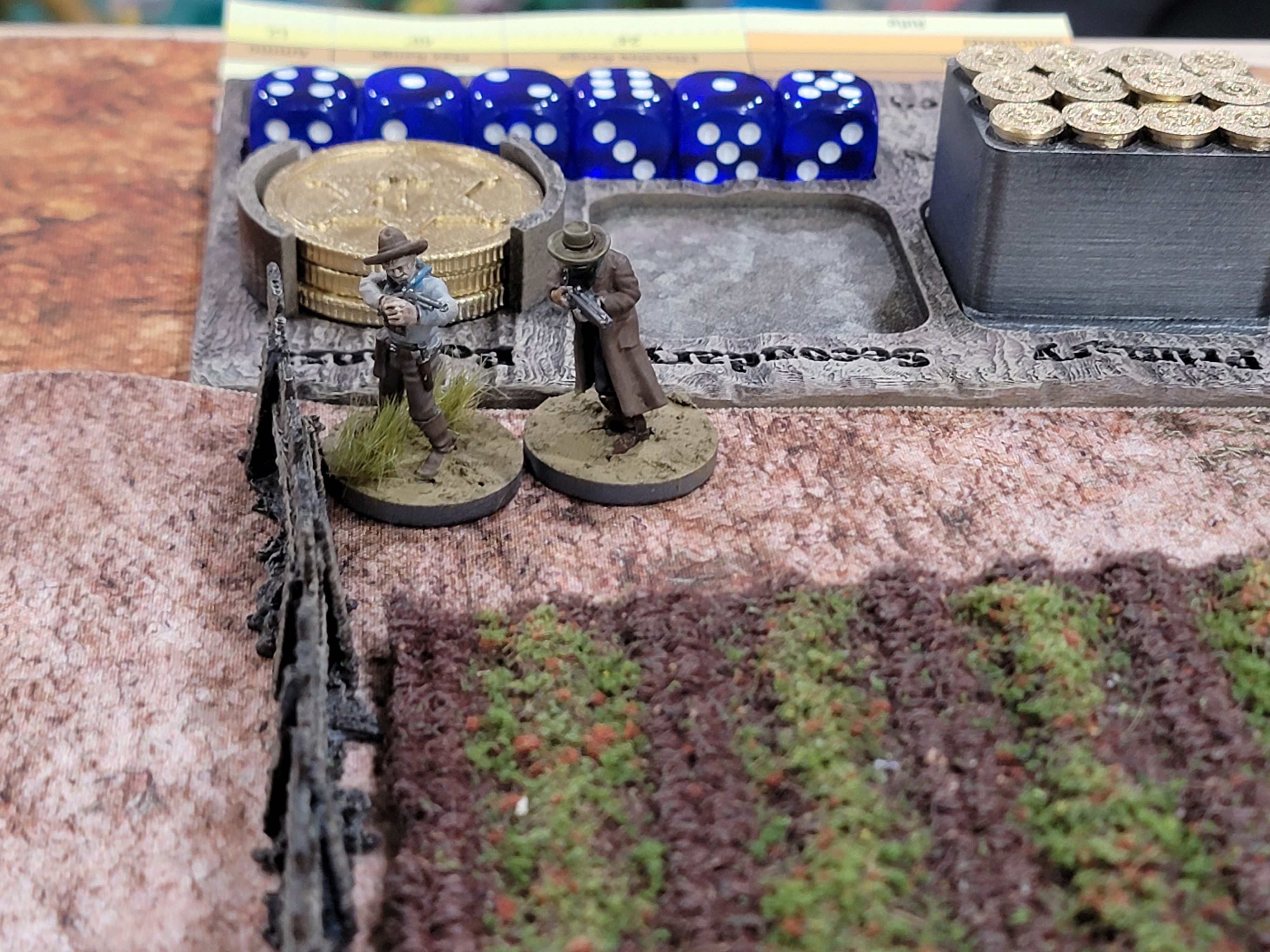 What a Cowboy is an unfortunate example of the opposite. It’s a simple ruleset in many ways, really. It just doesn’t explain itself very well. The flow of the game is genuinely pretty straightforward: you assign a playing card to each cowboy on the field, shuffle them together, then draw a card to see who activates. When activating, the cowboy rolls 6 Activation Dice which then map to actions that cowboy can take. He or she uses up those actions, then we draw the next card. Everything else is a wrinkle on top of this system. Bonanza coins let you interrupt, you can do some fancy-ish stuff, etc.