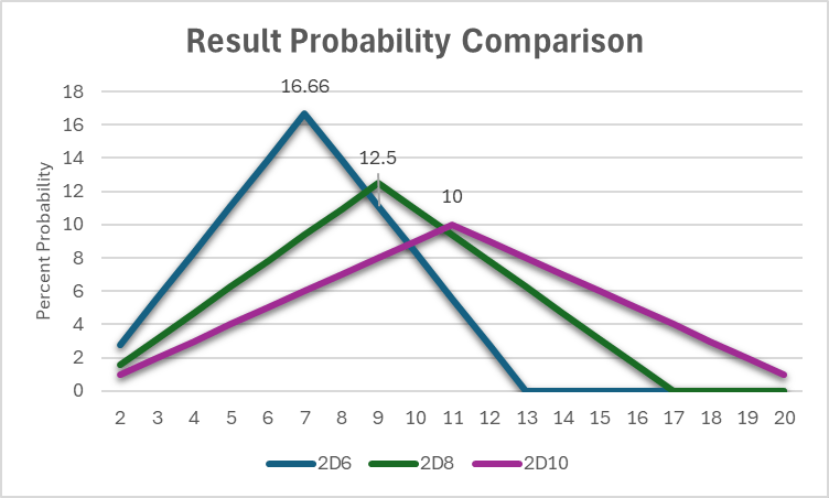 A few things leap out: 2D10 and 2D8 are triangular, not curves. 2D6 creates the classic bell curve. This means bonuses and penalties on the 2D6 add up faster. Notice how a (-2) would drop success from 58% to 27%–a 21% difference. With 2D8 it’s another 20% drop, whereas with 2D10 that would only drop it from 85% to 72%–a 13% difference. The reverse is also true: when revolving around 7+ success, bonuses benefit the 2D6 far more.
